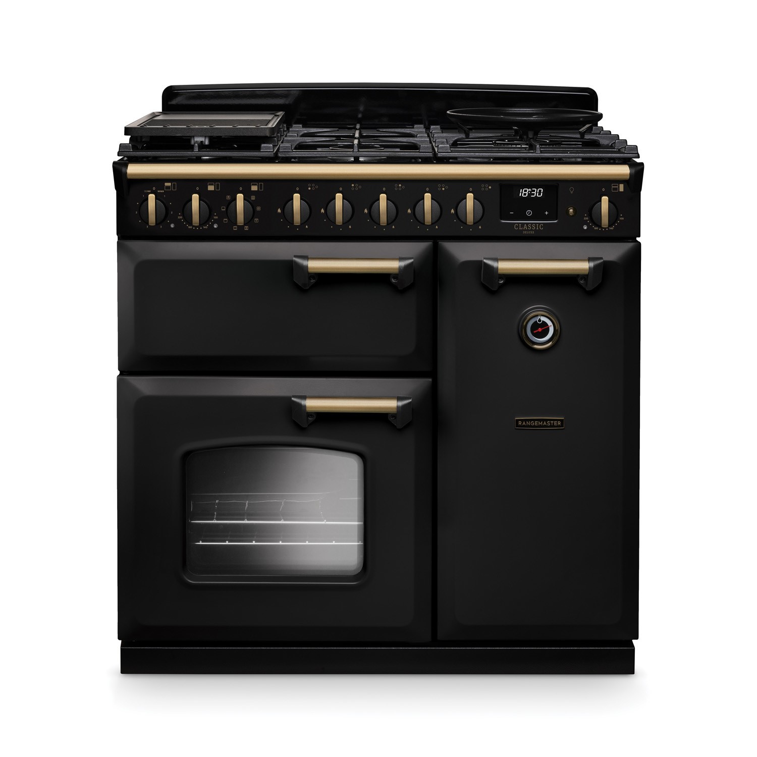 Rangemaster Classic Deluxe 90cm Dual Fuel Range Cooker - Gloss Black & Brass