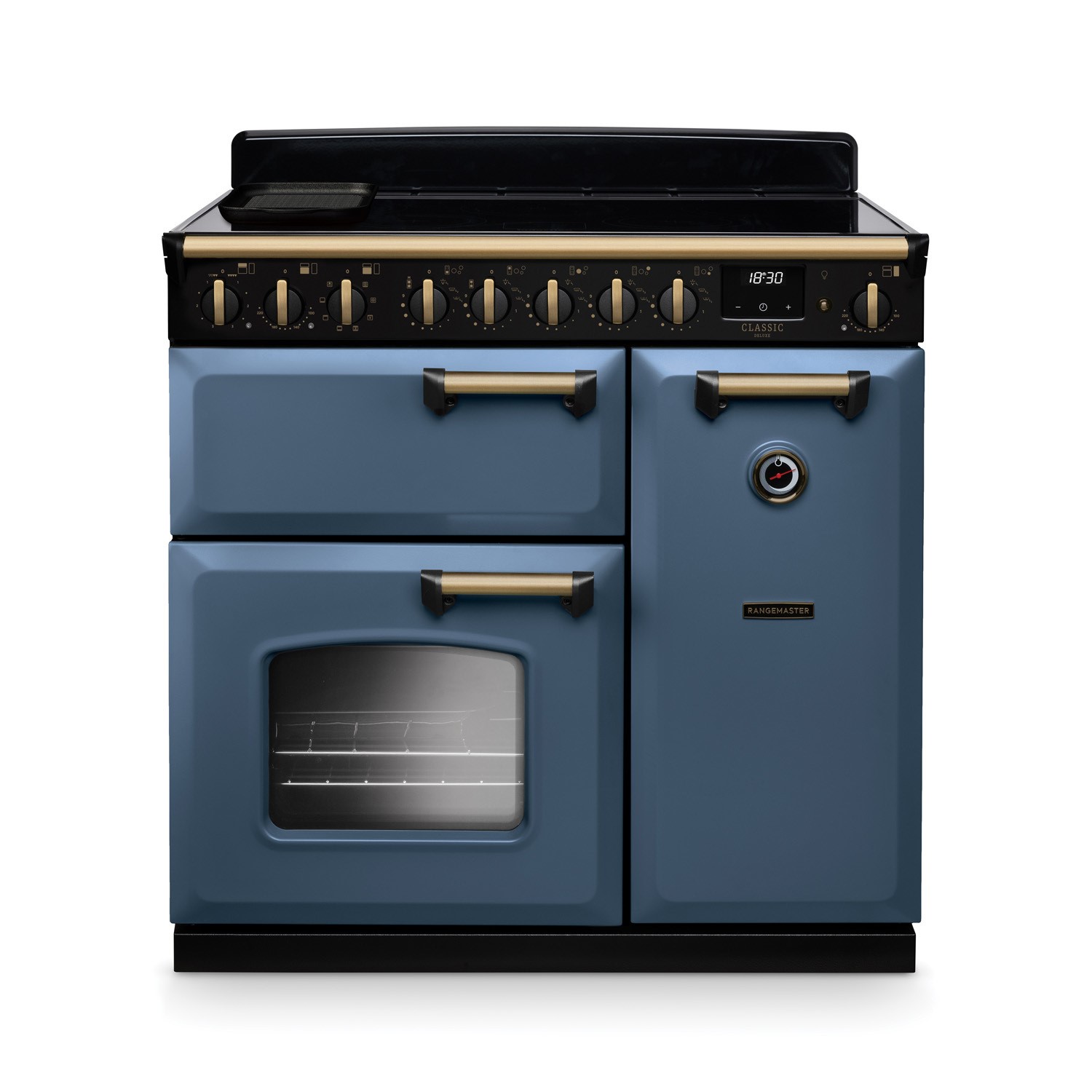 Rangemaster Classic Deluxe 90cm Dual Fuel Range Cooker - Stone Blue & Brass