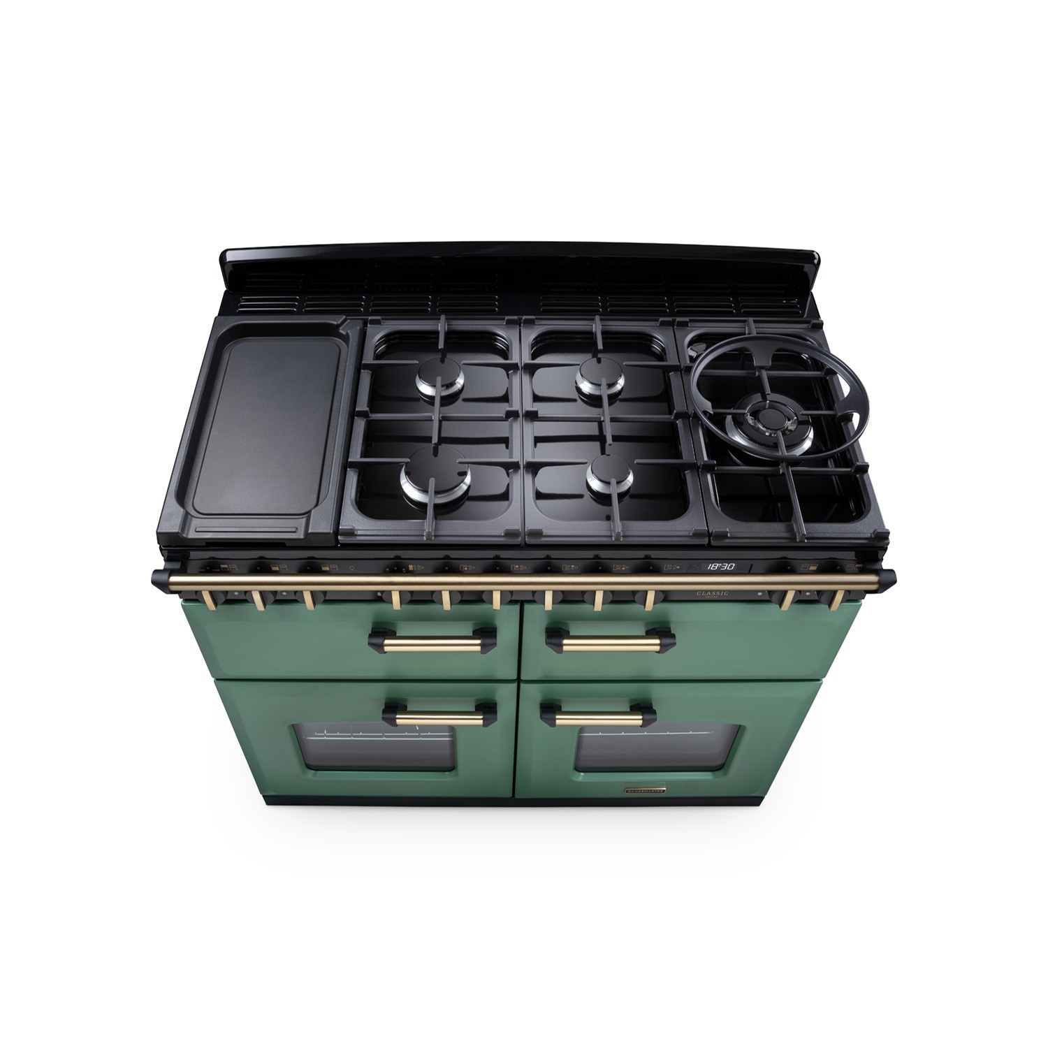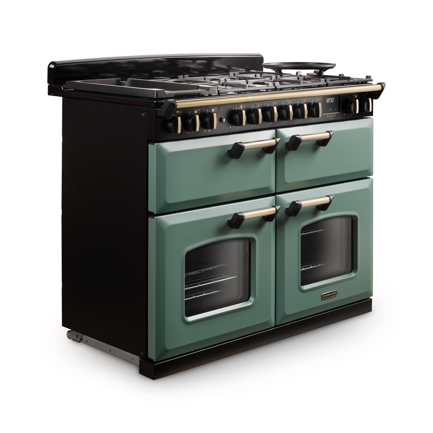 Rangemaster Classic Deluxe 110cm Base Cavity Dual Fuel Range Cooker - Mineral Green & Brass