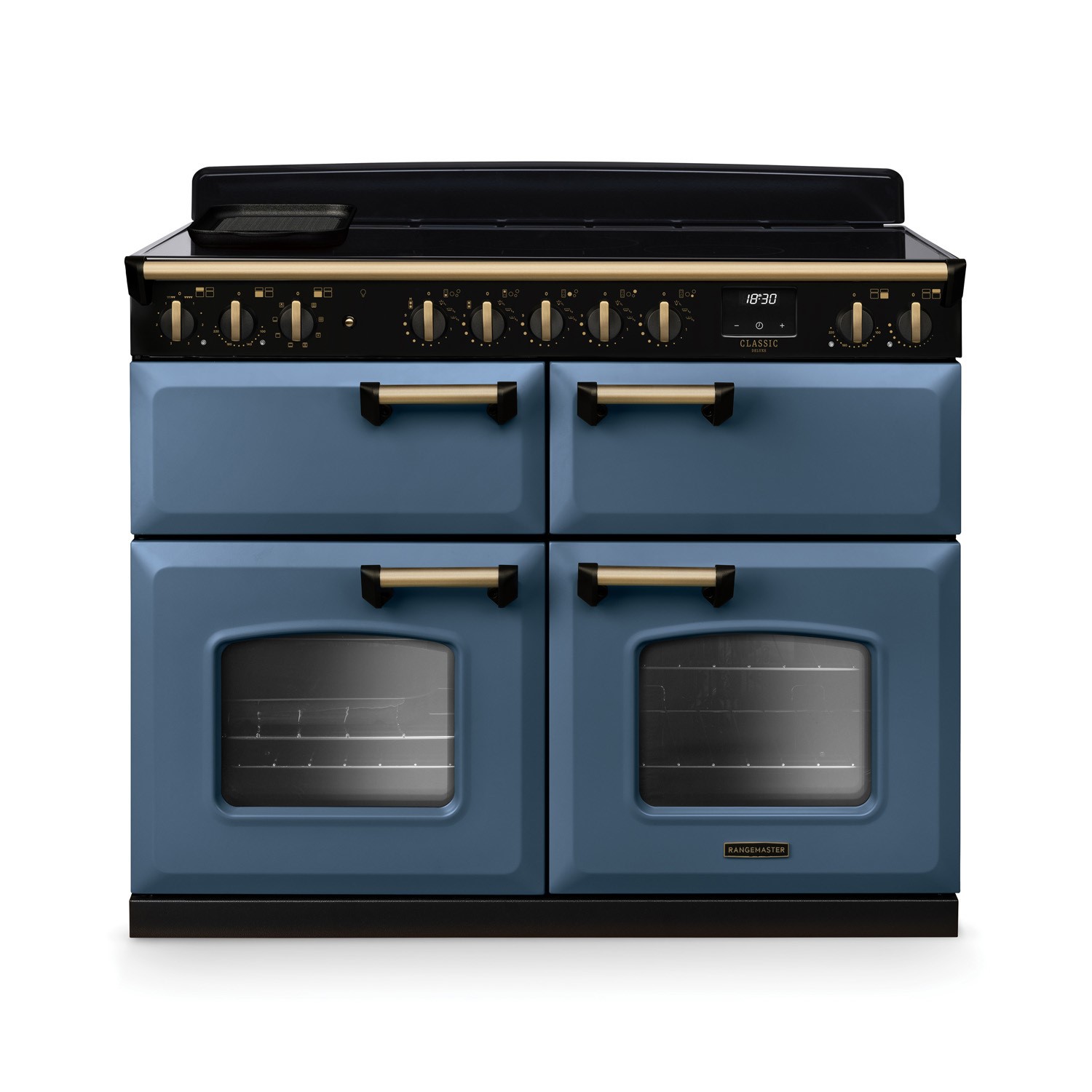 Rangemaster Classic Deluxe 110cm Base Cavity Induction Range Cooker - Stone Blue & Brass