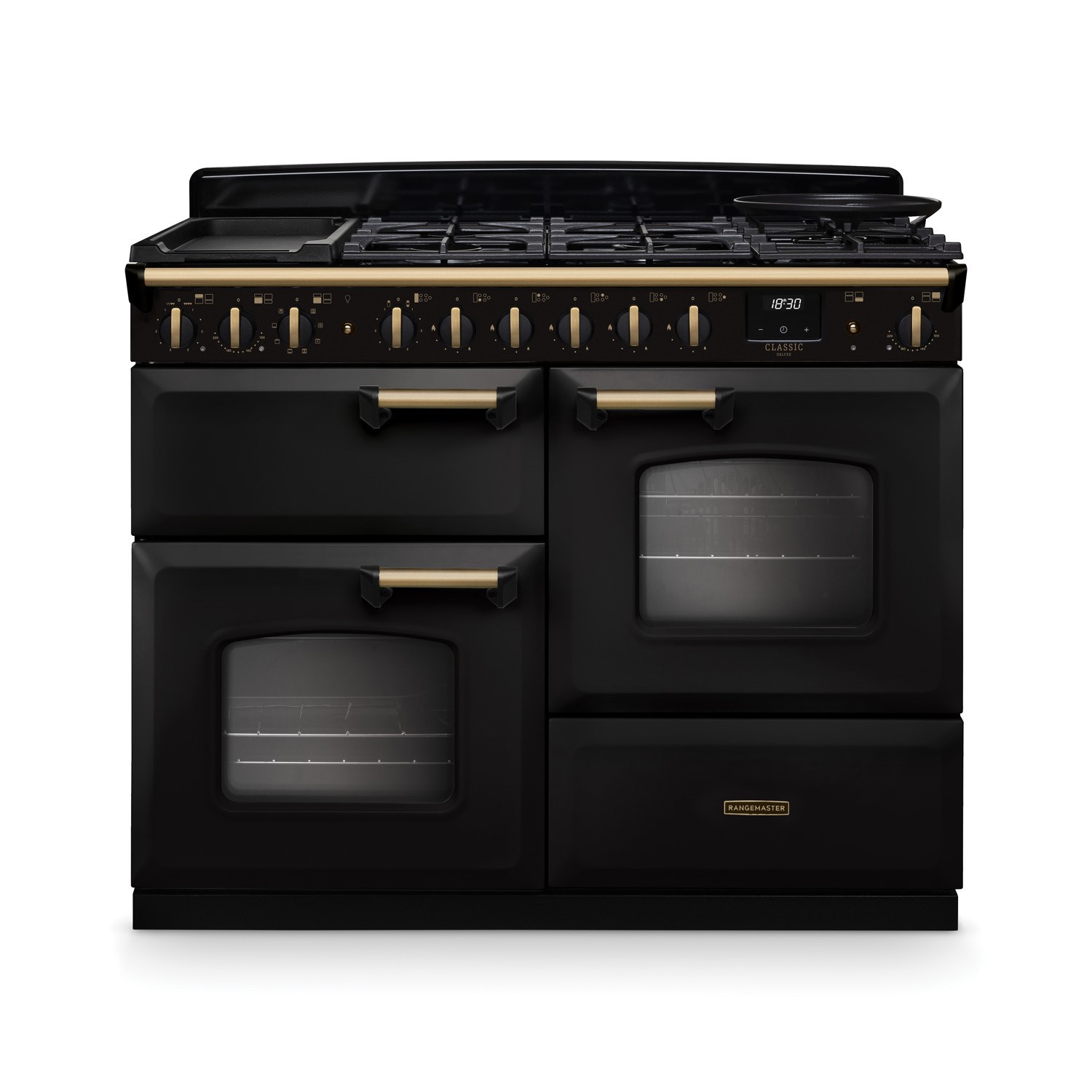Rangemaster Classic Deluxe 110cm Dual Fuel Range Cooker - Charcoal Black & Brass