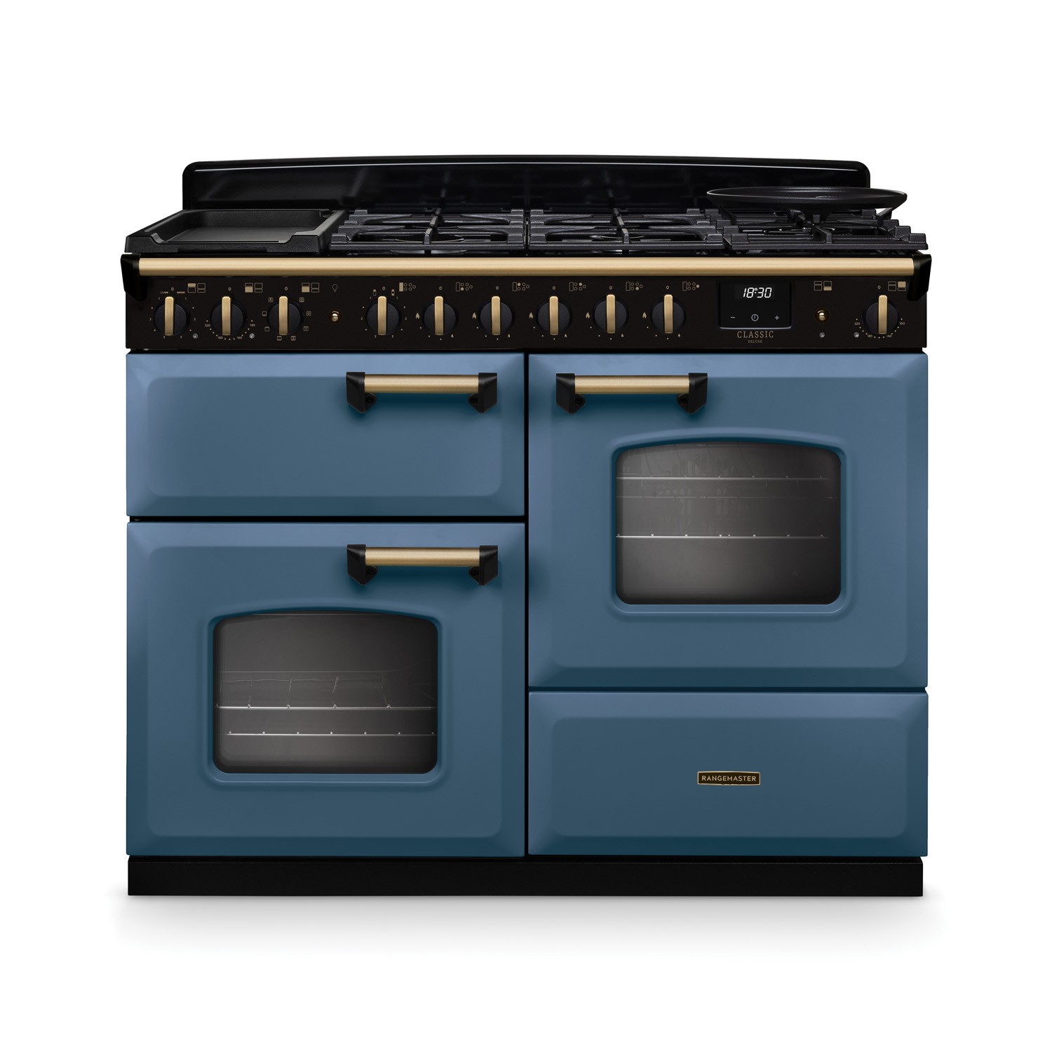 Rangemaster Classic Deluxe 110cm Dual Fuel Range Cooker - Stone Blue & Brass