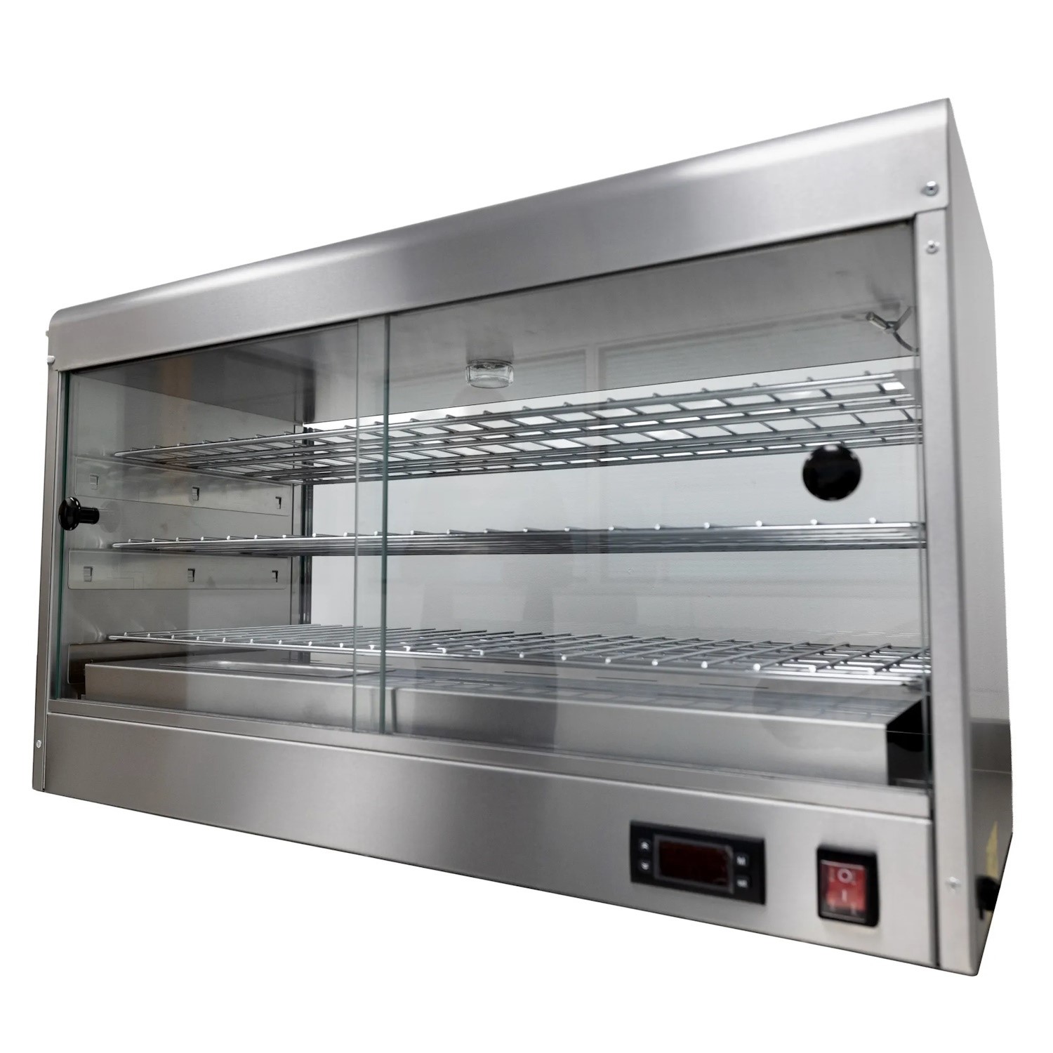 Simple and convenient to use with rear sliding doors for quick and easy access to goods whilst streamlining service and reducing waiting times for your customers. The internal lighting carefully illuminates the contents, further enhancing the presentation of your hot goods. Inside there are three removable wire shelves to provide great flexibility for arranging products of all sizes. A built in water reservoir / humidity tray aids humidity, thereby preventing your pastries from drying out and ensuring they stay deliciously fresh for longer. The unit is incredibly easy to clean thanks to its stainless steel structure.