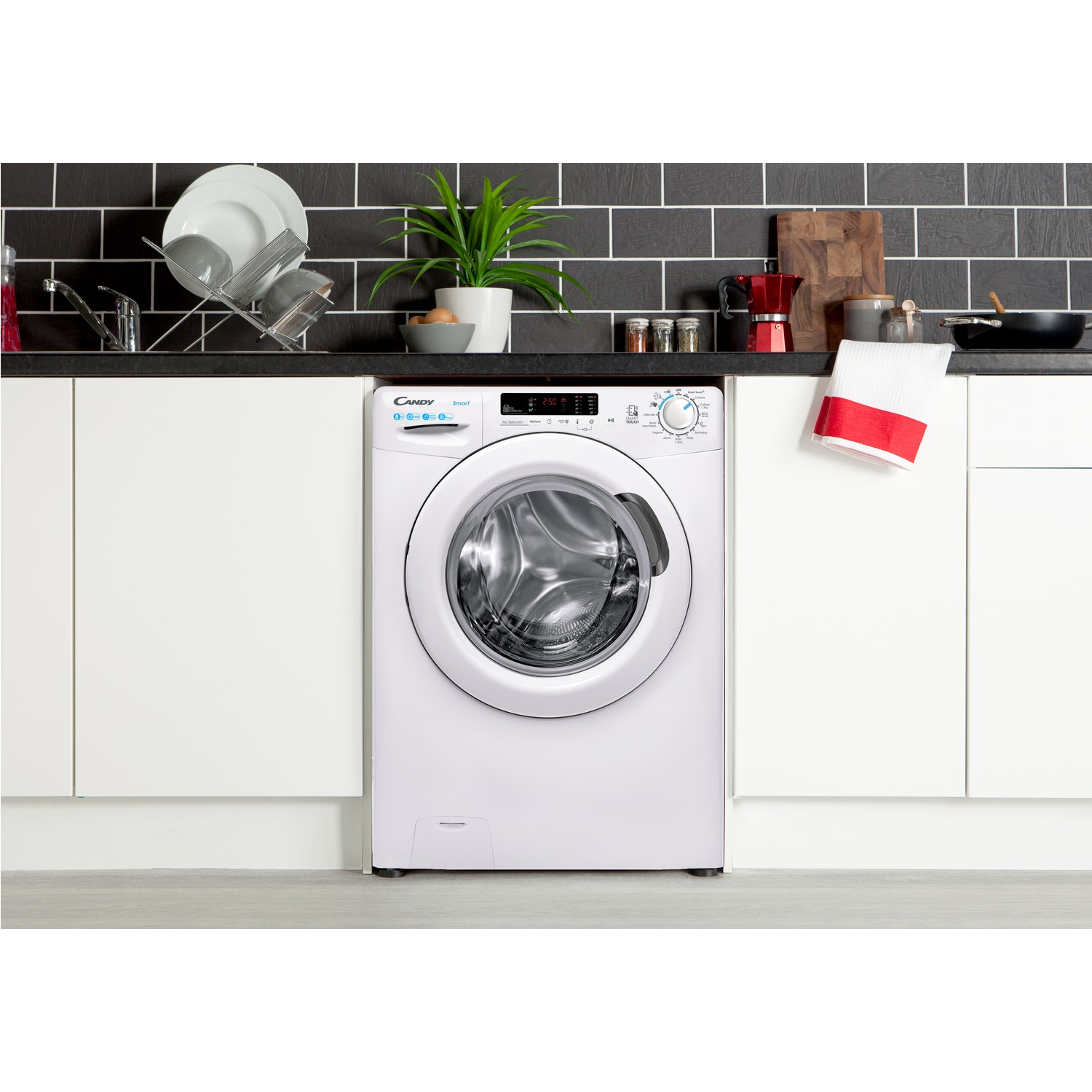 Make laundry day simpler with the Candy CS 1482DW4/1-80 Smart Washing Machine. Its large 8kg drum capacity means you can wash more clothes in one go, ideal for busy homes. This washing machine is also kind to your wallet, thanks to its B-rated energy efficiency. The KG Detector weighs your load and uses just the right amount of water and energy, helping to cut down your bills. Plus, with Smart Touch, you can use your smartphone to remotely control the washer, making laundry even easier.