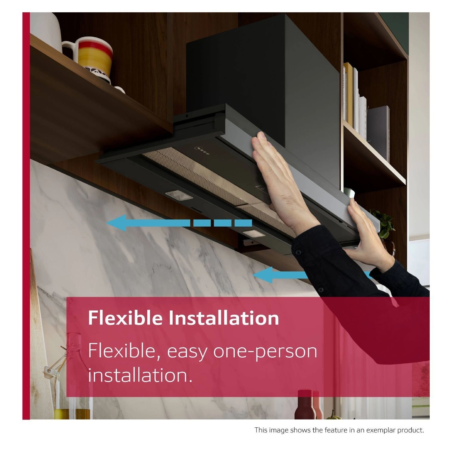 The Integrated Design Hood can be installed by a single person thanks to its well thought-out design, construction and assisting installation aids. It is the perfect replacement for other built-in hoods and offers many different configuration options. With the chimney extension, that can be purchased additionally, you can hide technical detalis such as the exhaust pipe. Thanks to its extensibility you can choose up to a cabinet height of over 90cm. The hood allows individual and flexible design of the cabinet, such as the number of shelves.