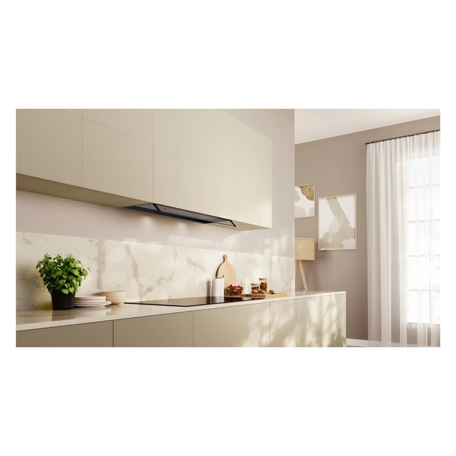 Do you want your kitchen to have a clean and minimalist look? Our Integrated Design Hood offers Seamless Integration, making it practically invisible when not in use. With its flush installation in an upper cabinet, it blends seamlessly into your kitchen design. And when in use, the only visible design element is an elegant glass panel. Say goodbye to bulky hoods and hello to a sleek and modern kitchen.