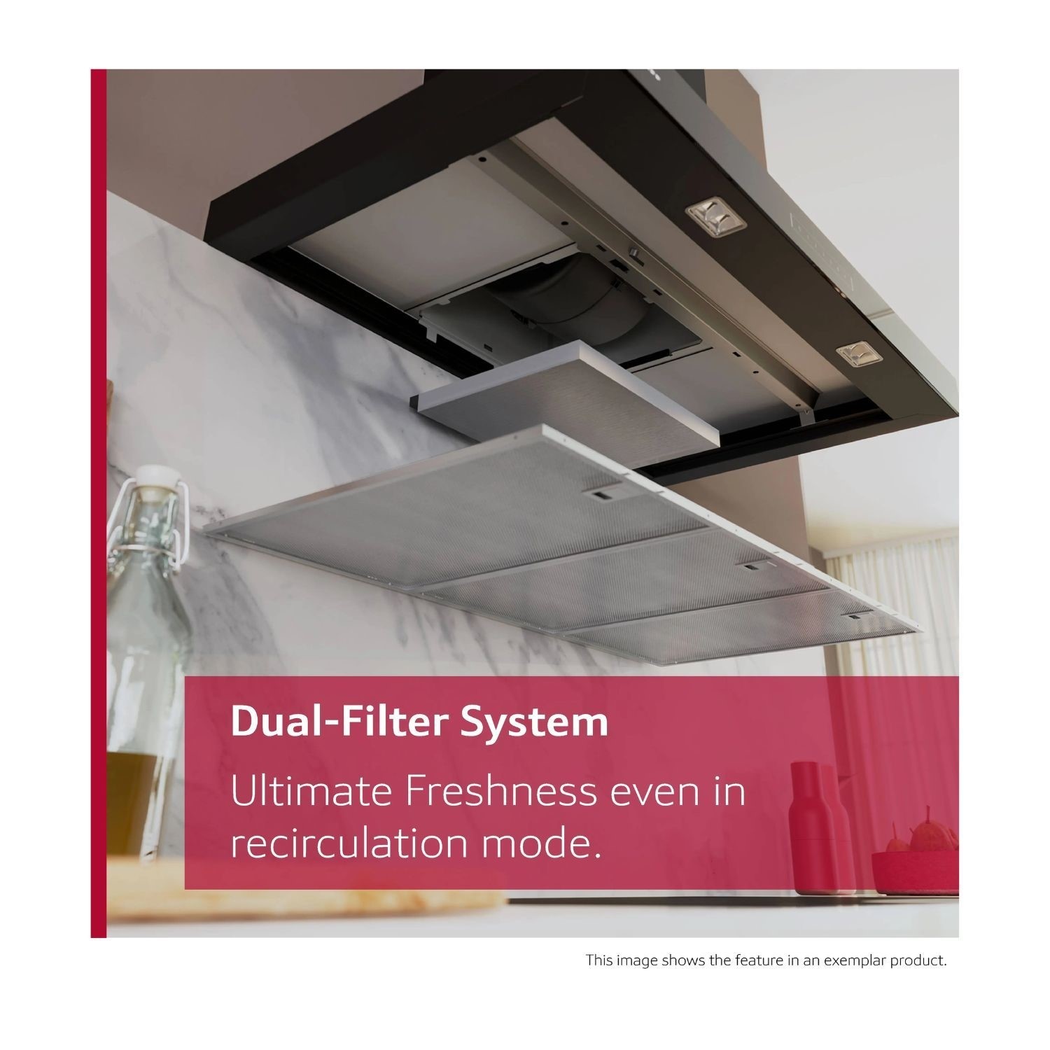 Enjoy fresh air even in recirculation mode with our advanced dual-filter system. The integrated metal filter captures coarse grease, while the Long-Life Clean Air Filter made from activated carbon handles finer grease particles and eliminates odours, including strong ones like fried fish. It is refreshable three times and lasts up to four years, it saves money and keeps your kitchen fresh. Get started with the recirculation kit, available as a separate accessory.