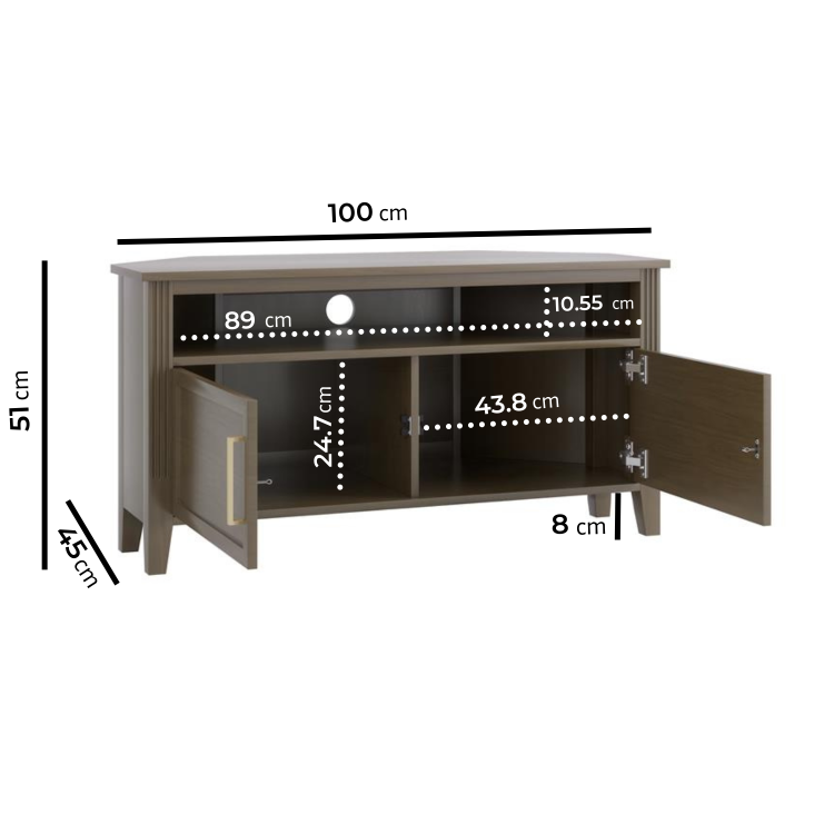 The Delilah Dark Wood Corner TV Unit blends classic charm with modern sophistication, making it a stylish centrepiece for any living space. Crafted from solid pine with a rich dark wood finish, it features elegant fluted side details and refined brass accents that add a subtle touch of luxury. Designed with practicality in mind, the unit offers a combination of cupboards a shelf and a central drawer to neatly conceal media accessories, remotes and everyday clutter. A built-in cable management hole keeps wires organised and out of sight, while the tapered legs create a light, elevated look that enhances the sense of space. Timeless yet contemporary, the Delilah TV Unit is the perfect balance of form and function for modern living rooms.