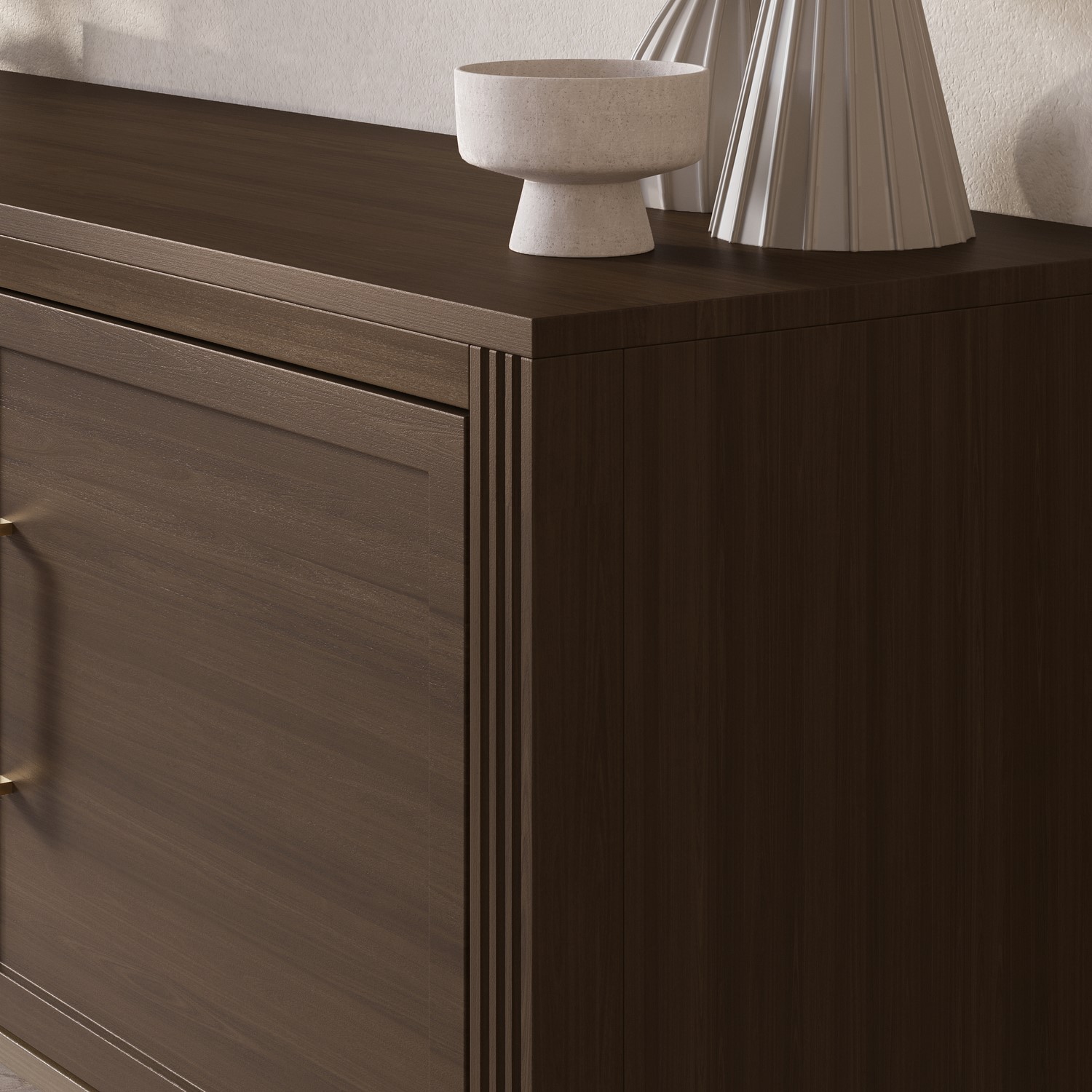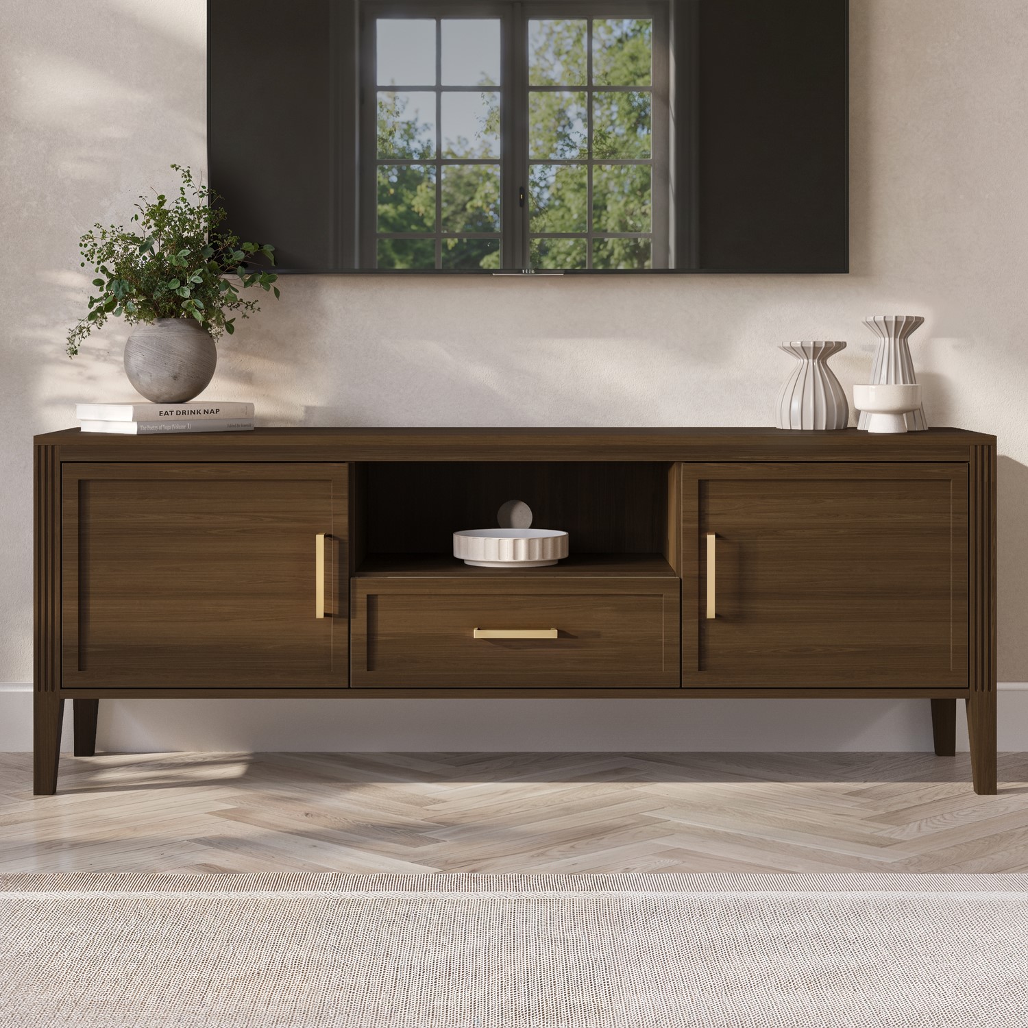 The Delilah Walnut TV Unit blends classic charm with modern sophistication, making it a stylish centrepiece for any living space. Crafted from solid pine in walnut finish, it features elegant fluted side details and refined brass accents that add a subtle touch of luxury. Designed with practicality in mind, the unit offers a combination of cupboards, a shelf and a central drawer to neatly conceal media accessories, remotes and everyday clutter. The three built-in cable management holes keep wires organised and out of sight, while the tapered legs create an elevated look that enhances the your space. Timeless yet contemporary, the Delilah Corner TV Unit is the perfect balance of form and function for modern living rooms.