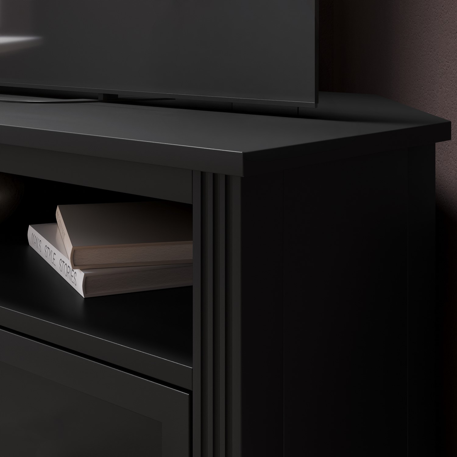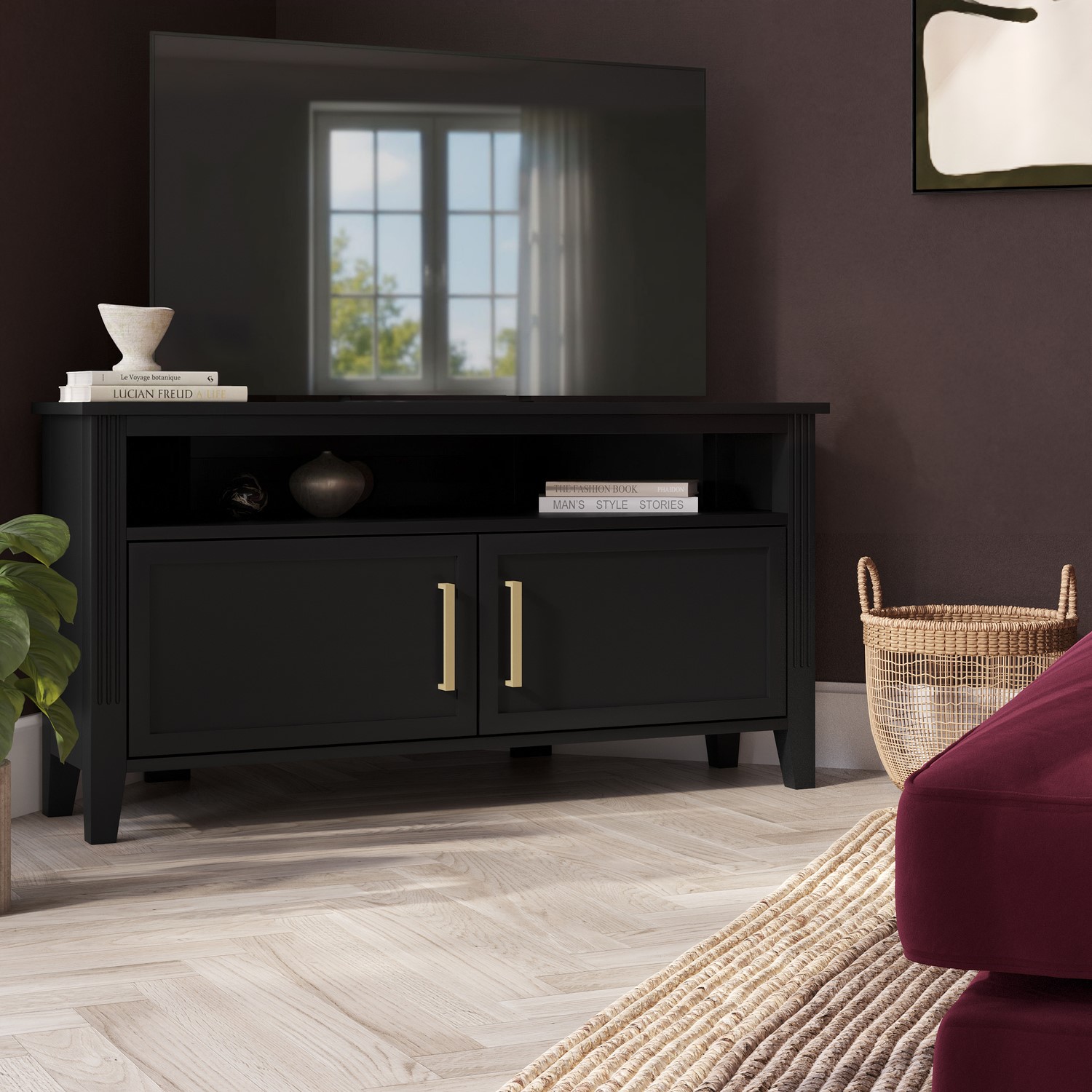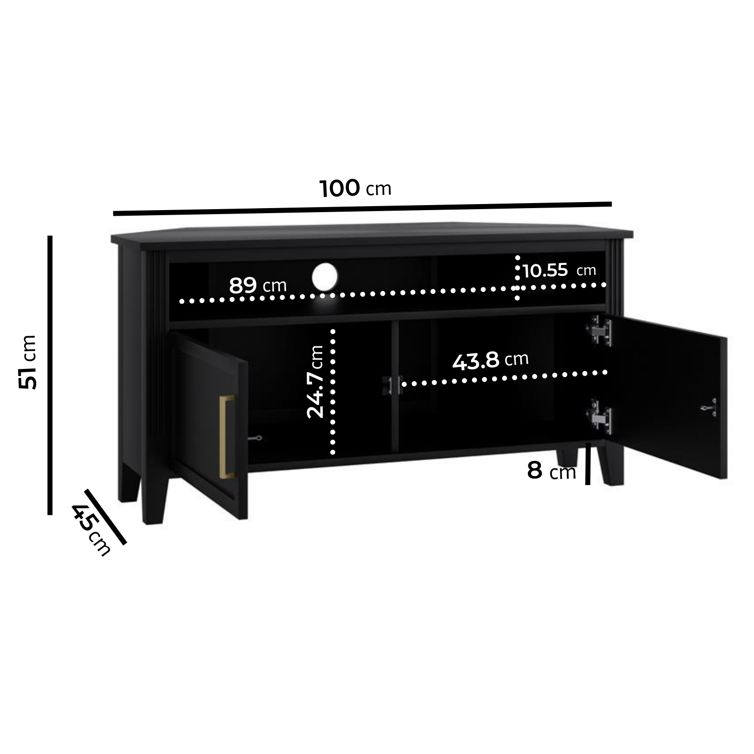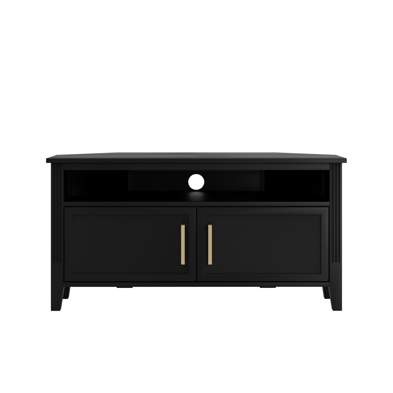 The Delilah Black Corner TV Unit blends classic charm with modern sophistication, making it a stylish centrepiece for any living space. Crafted from solid pine with black painted finish, it features elegant fluted side details and refined brass accents that add a subtle touch of luxury. Designed with practicality in mind, the unit offers a combination of cupboards a shelf and a central drawer to neatly conceal media accessories, remotes and everyday clutter. A built-in cable management hole keeps wires organised and out of sight, while the tapered legs create a light, elevated look that enhances the sense of space. Timeless yet contemporary, the Delilah TV Unit is the perfect balance of form and function for modern living rooms.