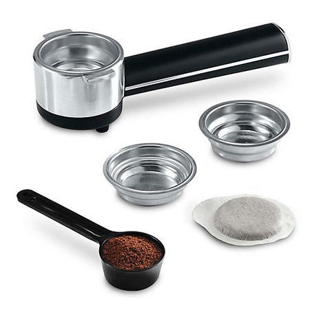 - Professional filter holder for ground coffee (1 or 2 cups) or “Easy Serving Espresso” pods with double wall crema filter
