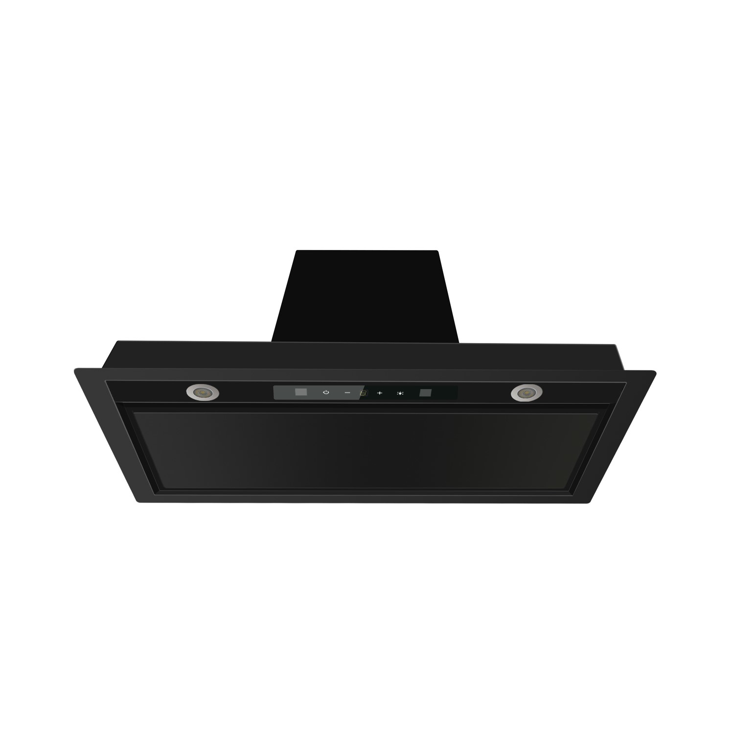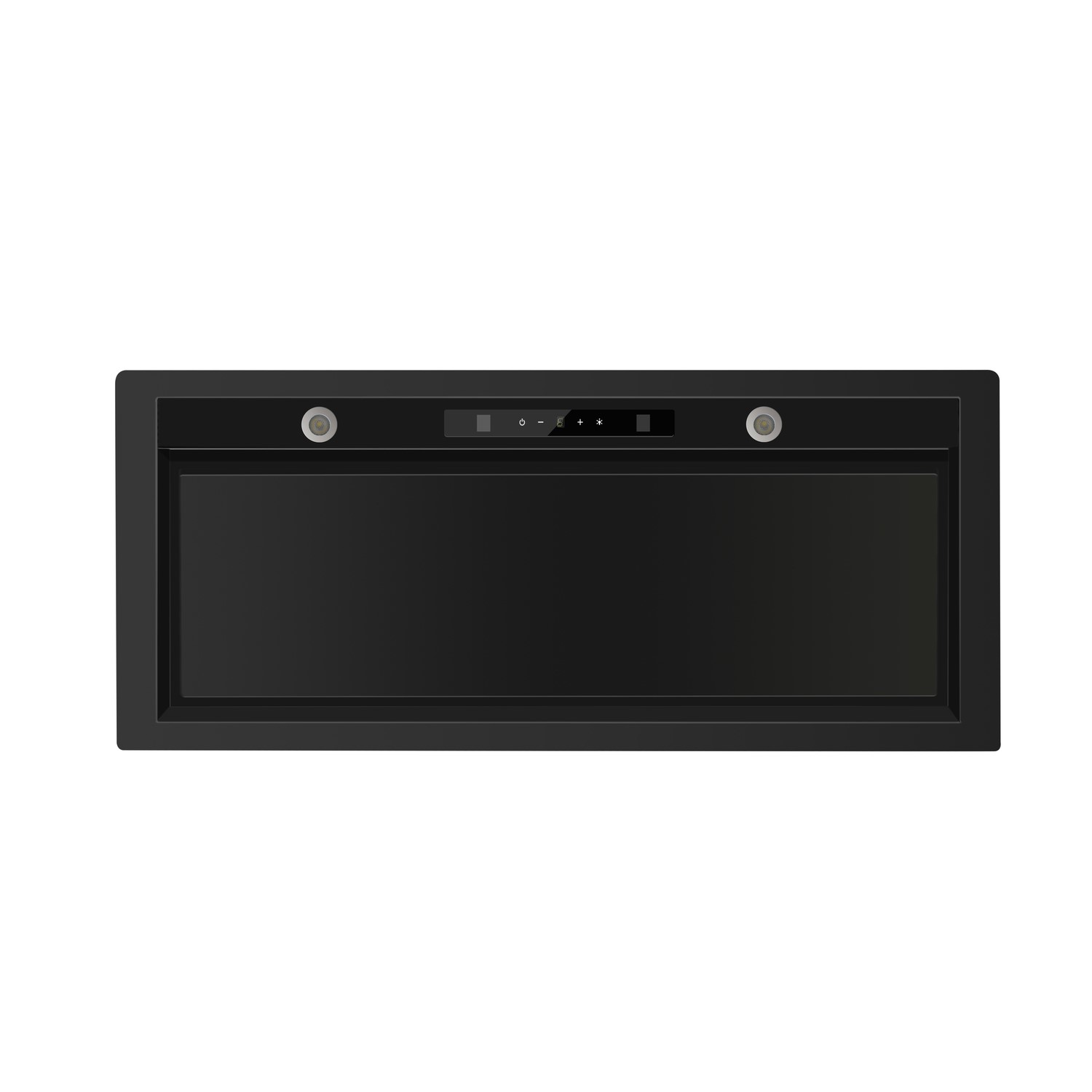 - Sleek black canopy hood designed for discreet built-in kitchen installations