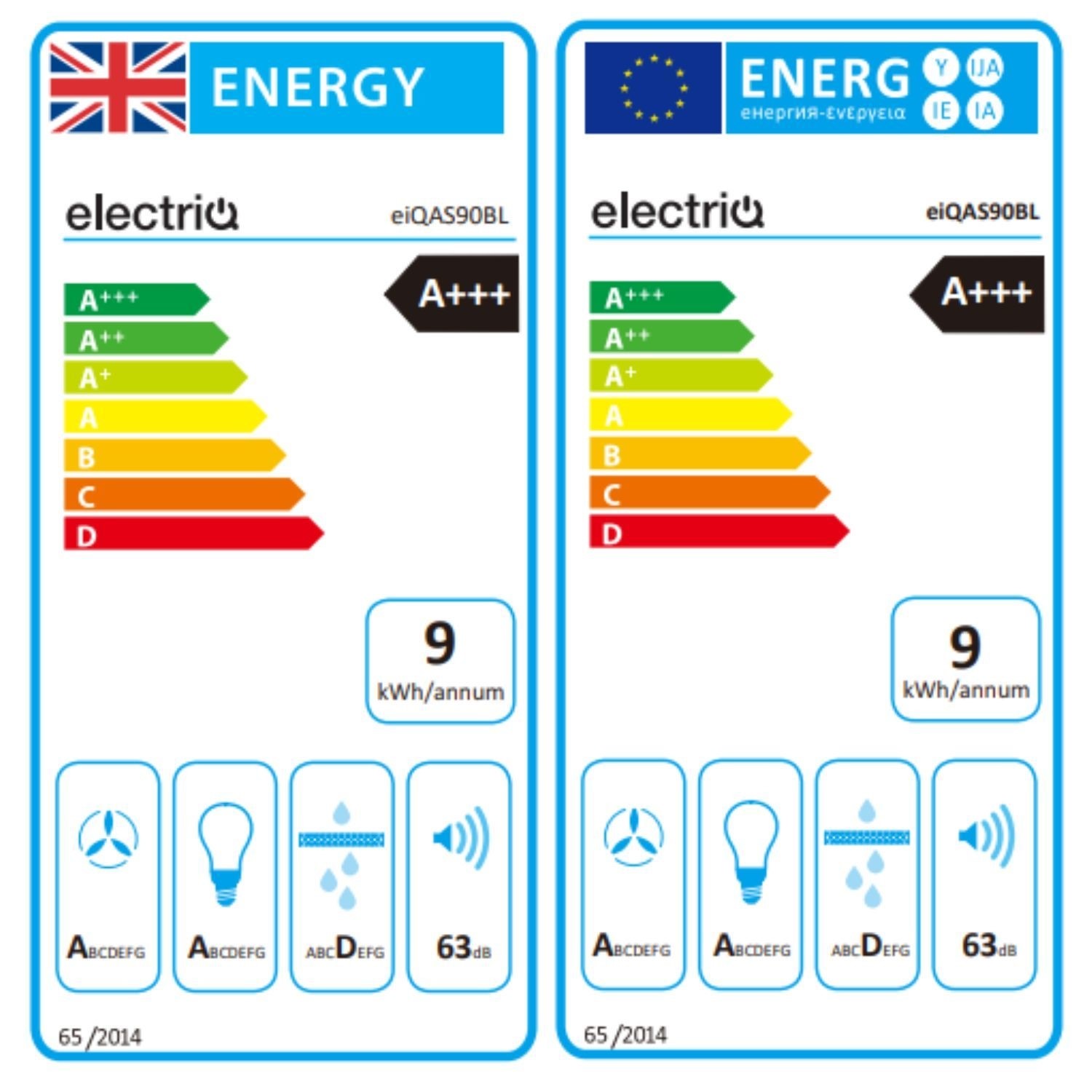 - Grease Filter: eiQGFAS6090BL / included (dishwasher-safe at 60°C)