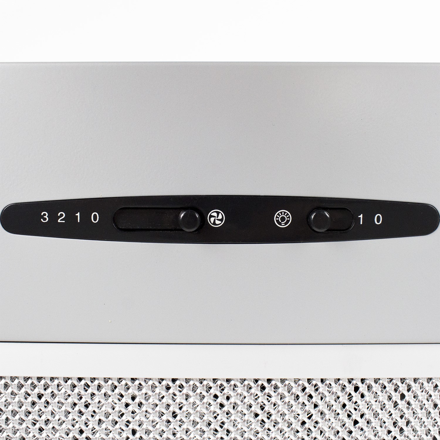 Both the extraction speed and halogen lighting are controlled by a simple slider controls at the front of the hood. The steamier your kitchen, the higher speed you need. Turn your hood on before you begin cooking for a more effective extraction.