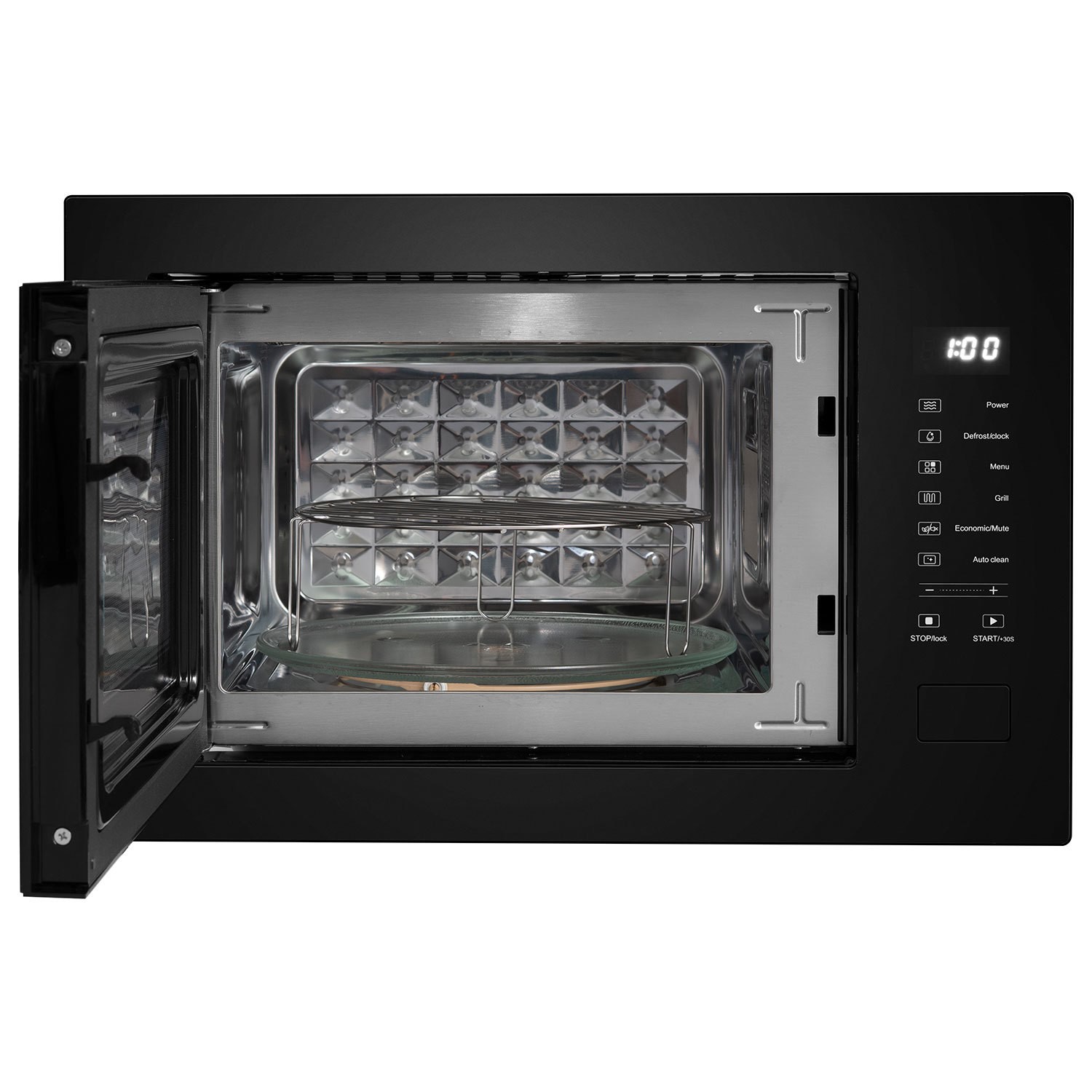 Enjoy 60-minute cooking timers, five microwave power levels, and eight auto cooking menus for versatile performance. A black door frame and control panel add a premium touch, ensuring it looks as good as it performs. The stainless steel cavity ensures easy cleaning and provides a healthier cooking environment.
