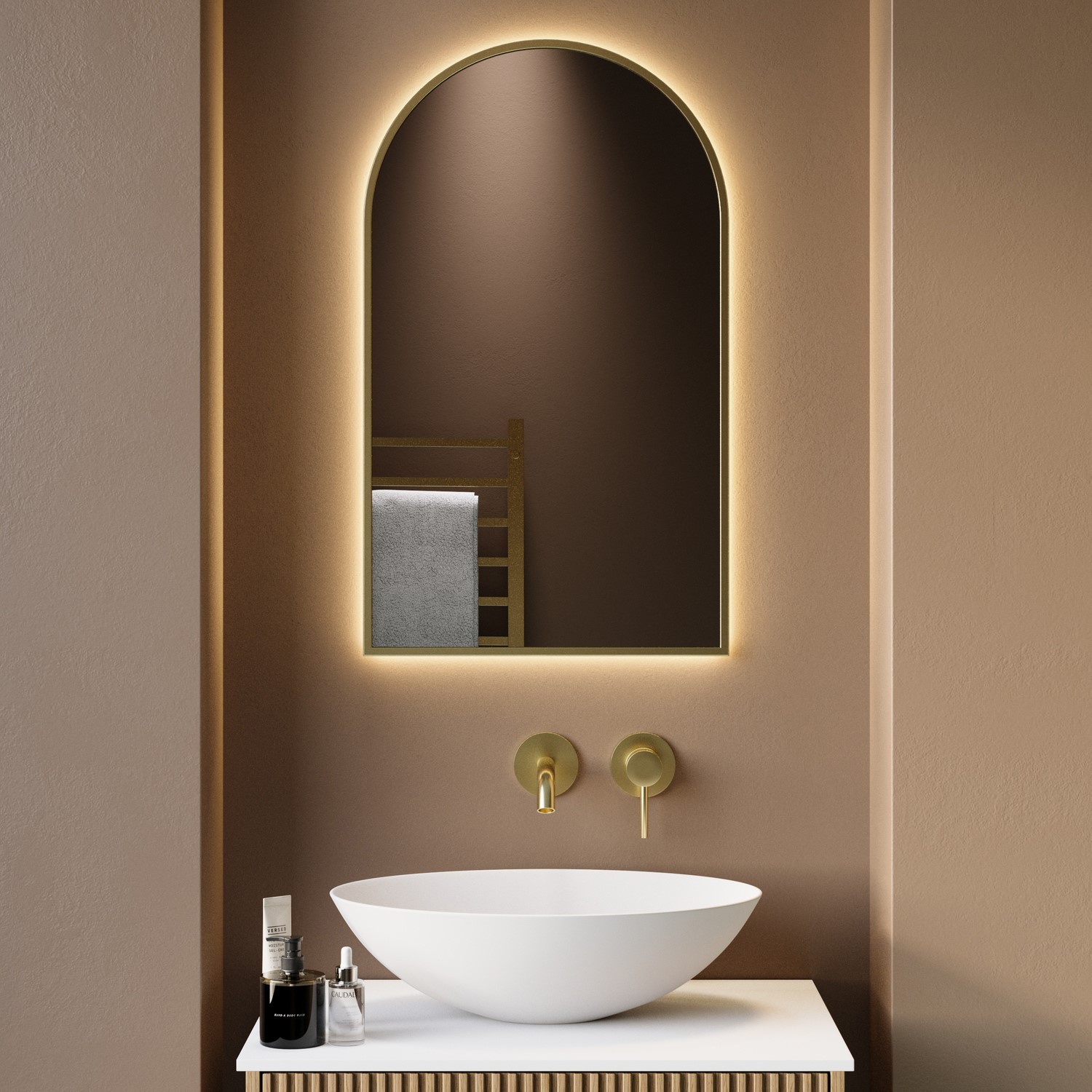 Upgrade your bathroom with this beautifully designed Empire arched backlit mirror with lights featuring a sleek brushed brass frame. Measuring 500x800mm, this small mirror is a smart choice for modern cloakrooms and bathrooms. The sleek 10mm brushed brass frame adds a modern, minimalist edge and provides a striking contrast that matches perfectly with other brushed brass bathroom fixtures. The soft backlit glow frames your reflection perfectly while offering practical lighting for everyday routines. The adjustable colour temperature allows you to switch seamlessly between warm white (3000K), natural white (4000K), and cool white (6500K) to complement any mood or activity. Our innovative dimmable feature takes versatility even further, letting you set the perfect brightness for any occasion. Start your day with bright, clear illumination for precise grooming and makeup application, then lower the intensity in the evening to create a calming, tranquil atmosphere. The built-in memory function automatically saves your preferred brightness and colour temperature settings, so your mirror remembers exactly how you like it every time you switch it on – no need to readjust with each use.
