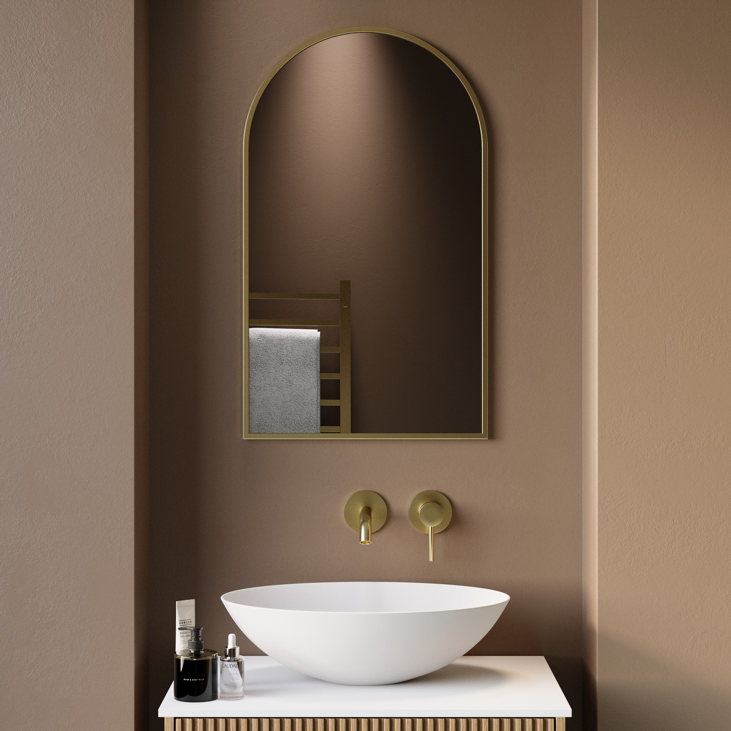 Modern Statement: With its gently curved arched top and thin brushed brass frame, this mirror makes a bold yet elegant statement in any contemporary bathroom.