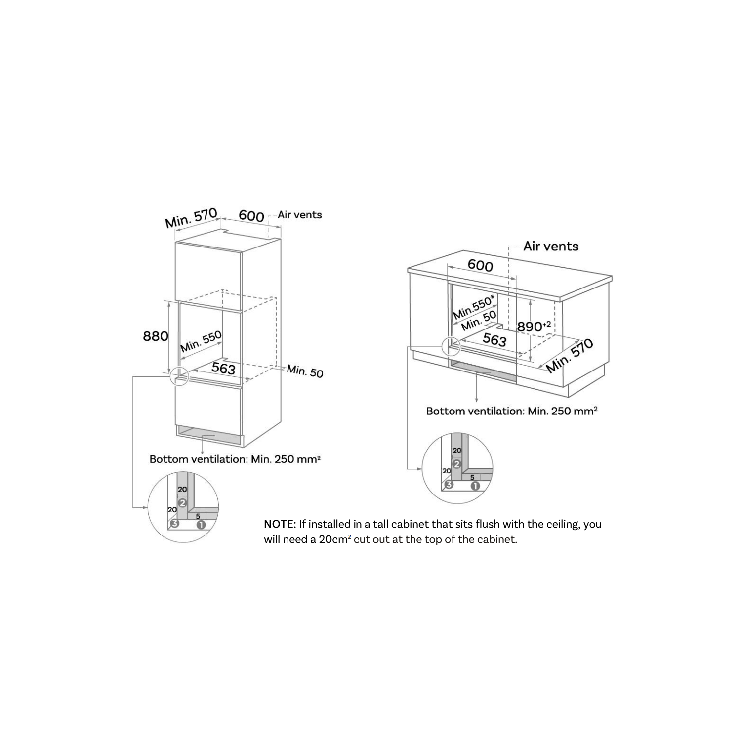 - Oven dimensions: H 885 x W 595 x D 563 mm