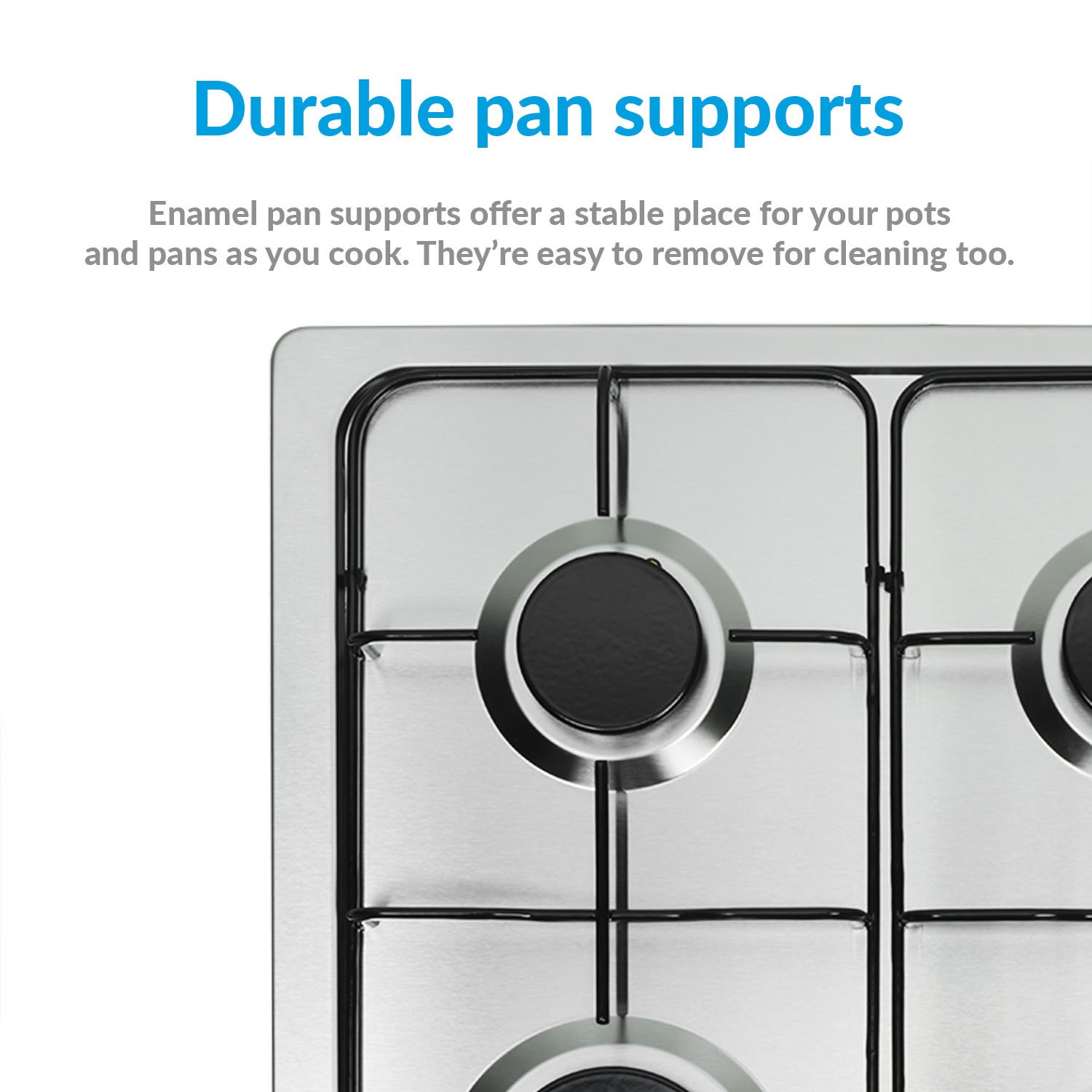 - Removable pan supports and a smooth stainless steel surface make cleaning quick and easy