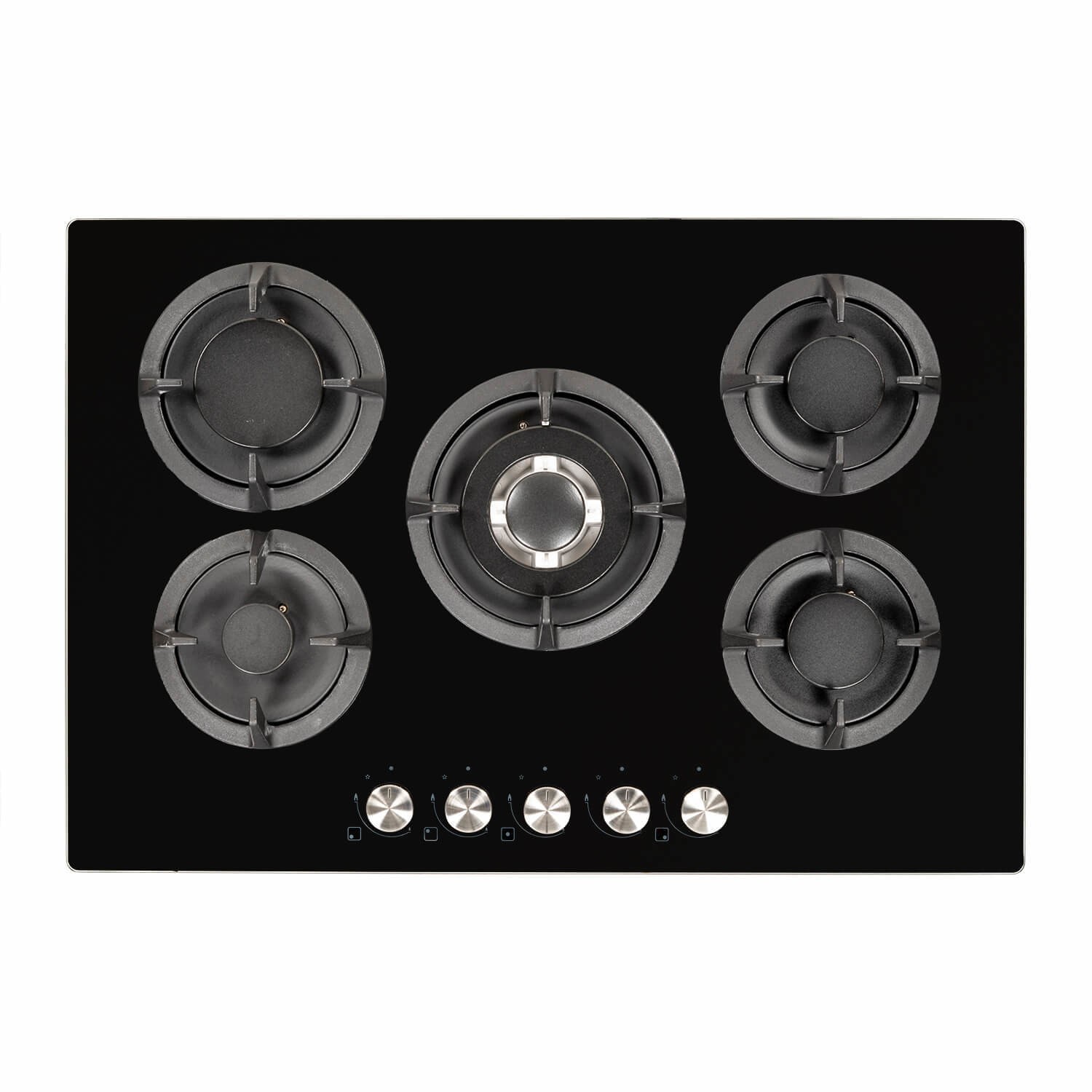 This stylish gas-on-glass hob offers style, space and efficiency; everything you'd want for the new addition to your kitchen. Featuring five burners in total, the central wok burner is ideal for searing meats and stir-fries as you prepare sides and sauces on the surrounding burners. All controlled using simple dials at the front of the hob, it's easy to ignite and adjust the flames while removable pan supports and the smooth glass surface make cleaning and maintenance easy.