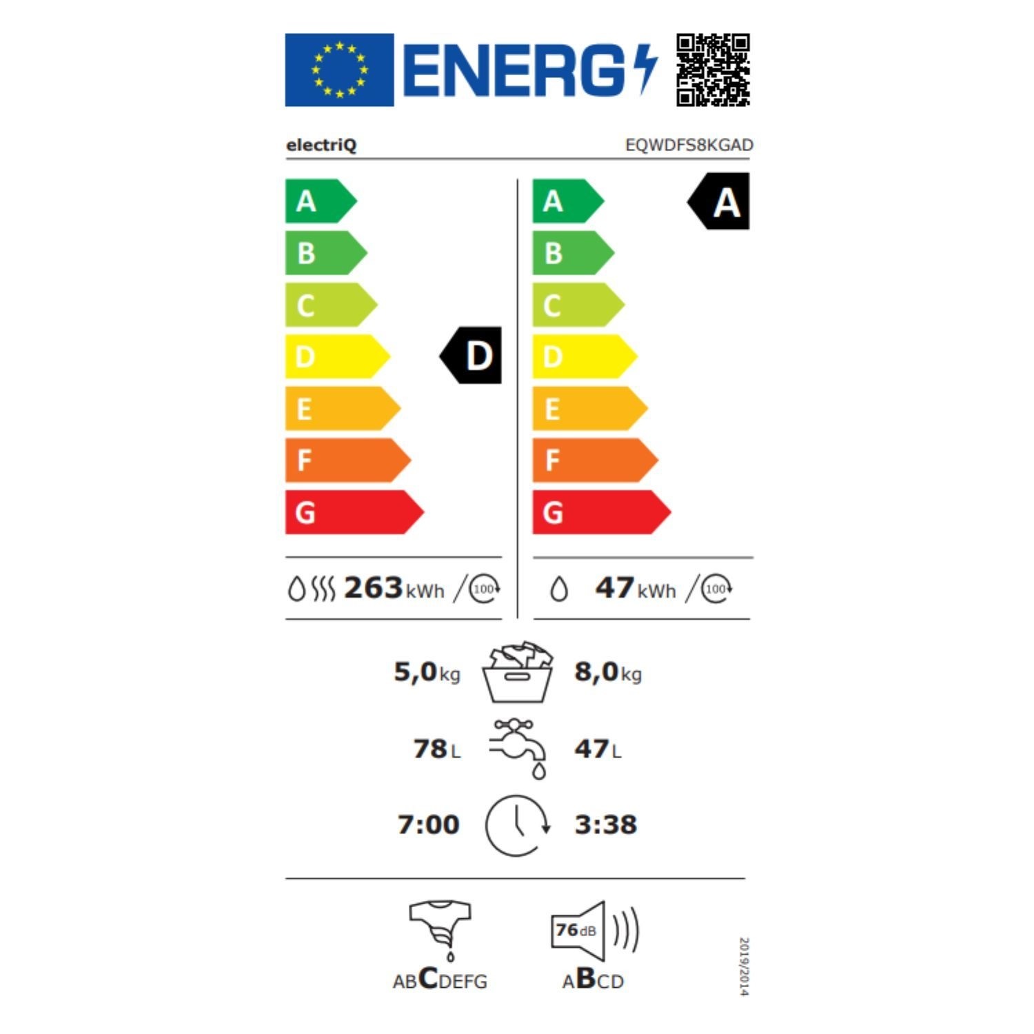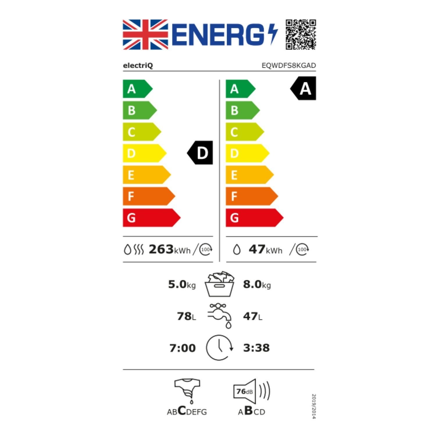 This washer dryer has a A-class* energy rating, which means it helps to save energy usage, and money on your bills and protects the environment. The rating is in compliance with the New Energy Label and compared with the E class.