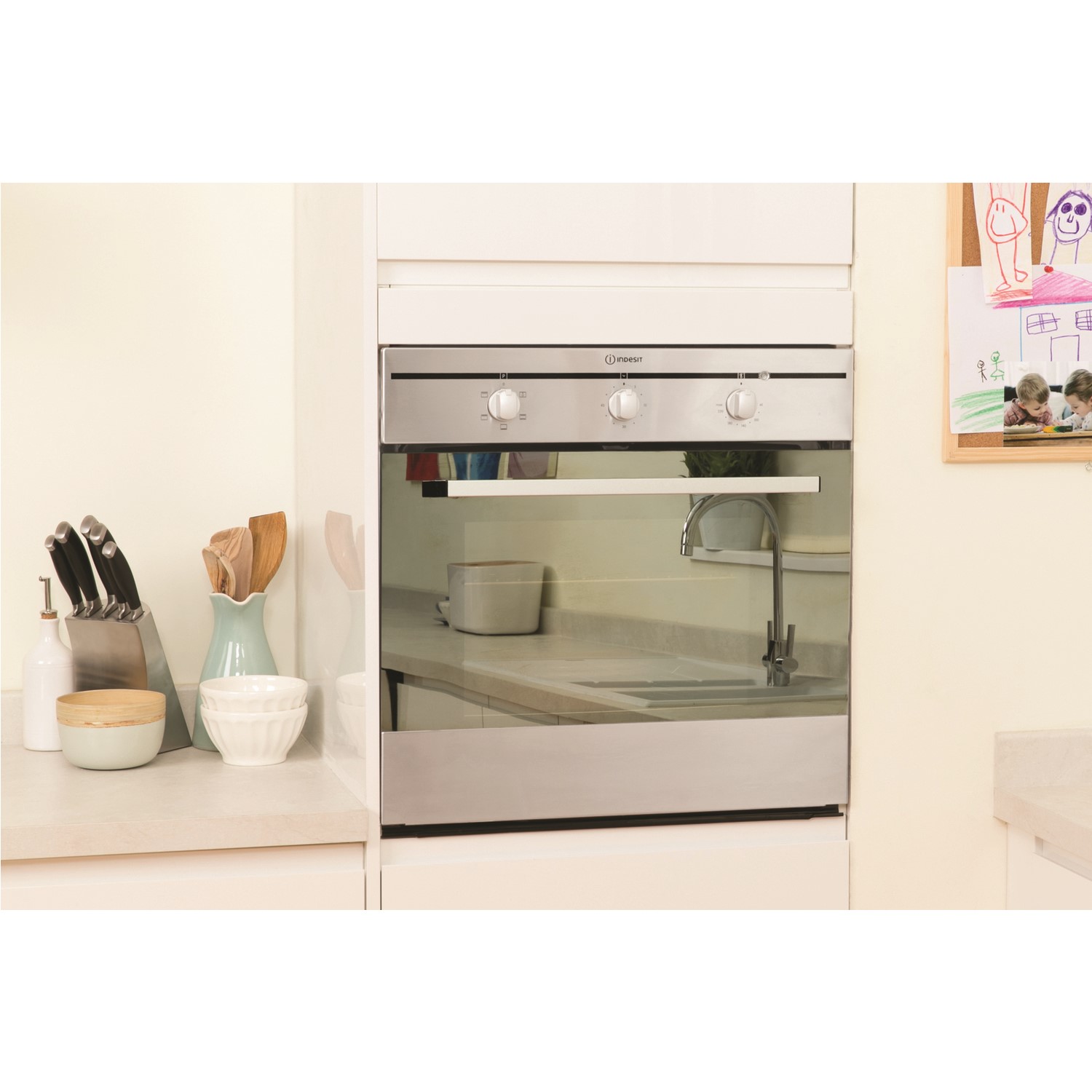 There are three control knobs on this Indesit oven: one for the oven functions, one for the timer and one for the thermostat. The thermostat control knob comes with an indicator light that will light up when the oven has finished pre-heating to make sure you are putting your food in at the correct temperature.