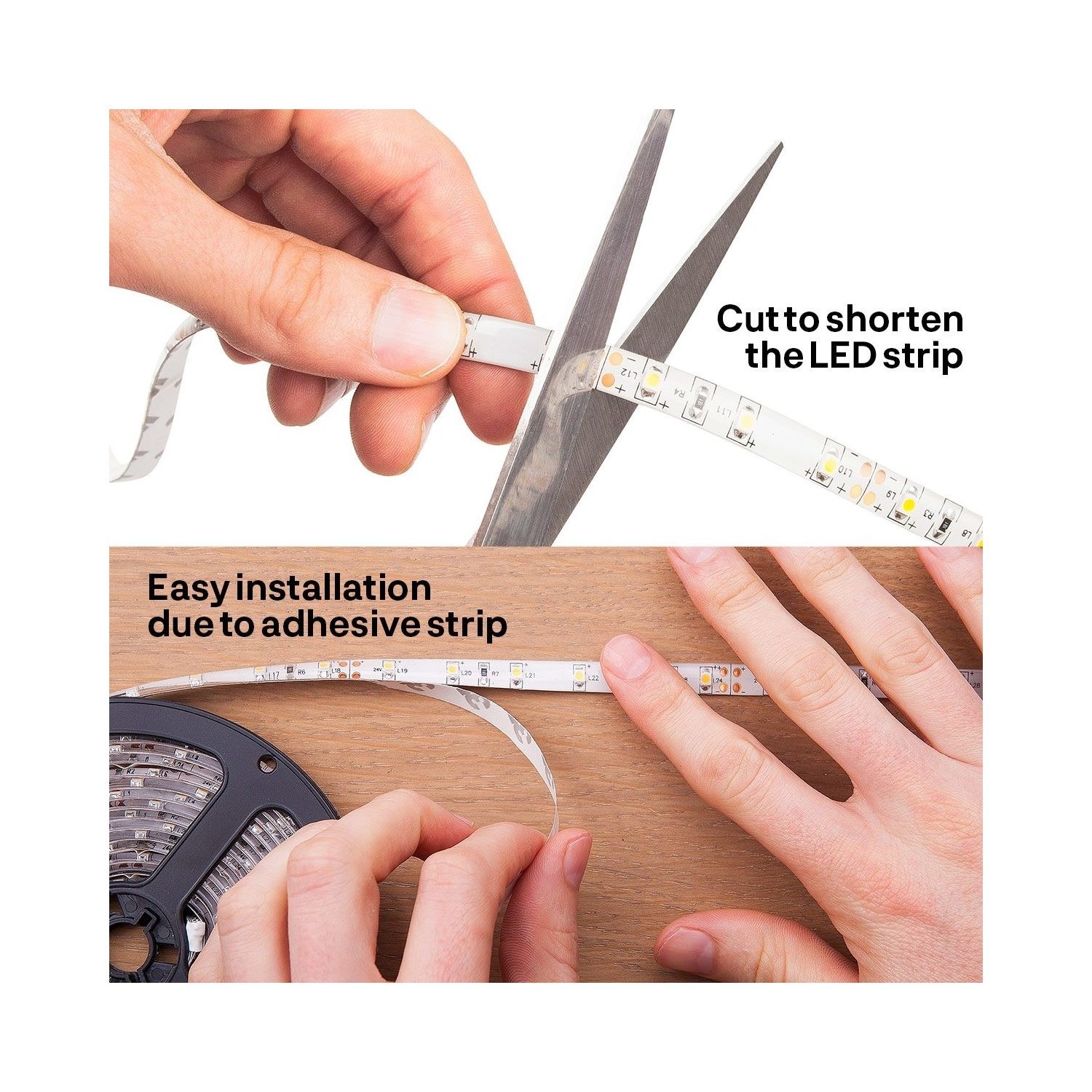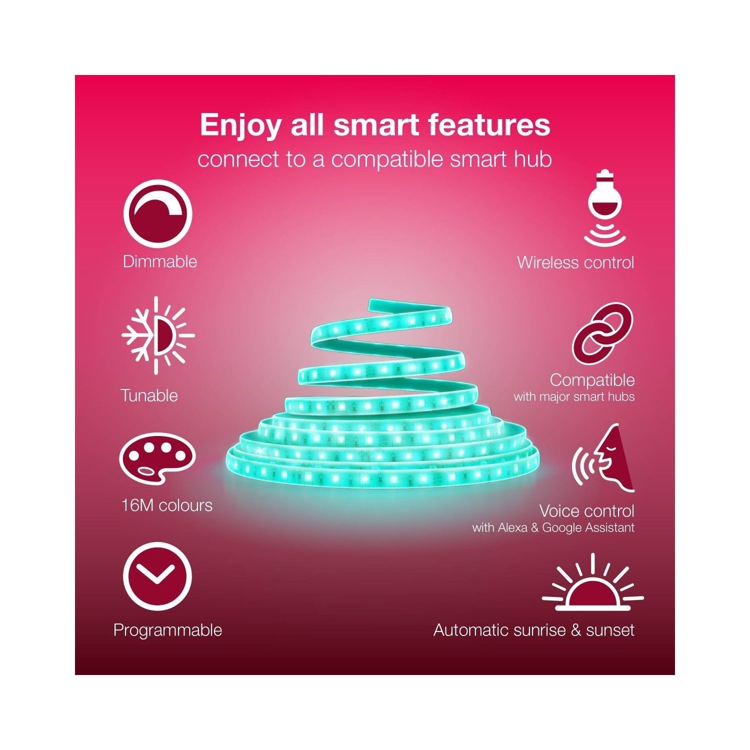 4m colour strip, 240 LED lights (30 RGB + 30 WW LEDs /m), 1200lm. NO POWER PLUG included, the LED driver should be connected to 230V directly. Comes with 1m of power cable. Decorative colour LED strip, the smart version of the well-known flexible RGBW LED strip. This flex strip can only be cut shorter, it can not be extended. After cutting, the cut off part can not be added. 16 Million colours of LED light. Pick a colour that matches your mood and colour your interior. ick a colour that matches your mood and colour your interior. The strip can function as a disco light when you use your favorite party app and the Philips Hue bridge.