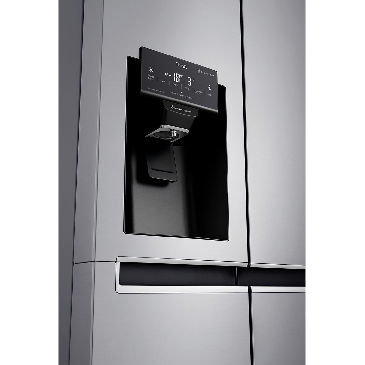 Equipped with a slim SpacePlus ice system you get the convenience of filtered water and crushed or cubed ice with the push of a button, without any loss of freezer storage space.