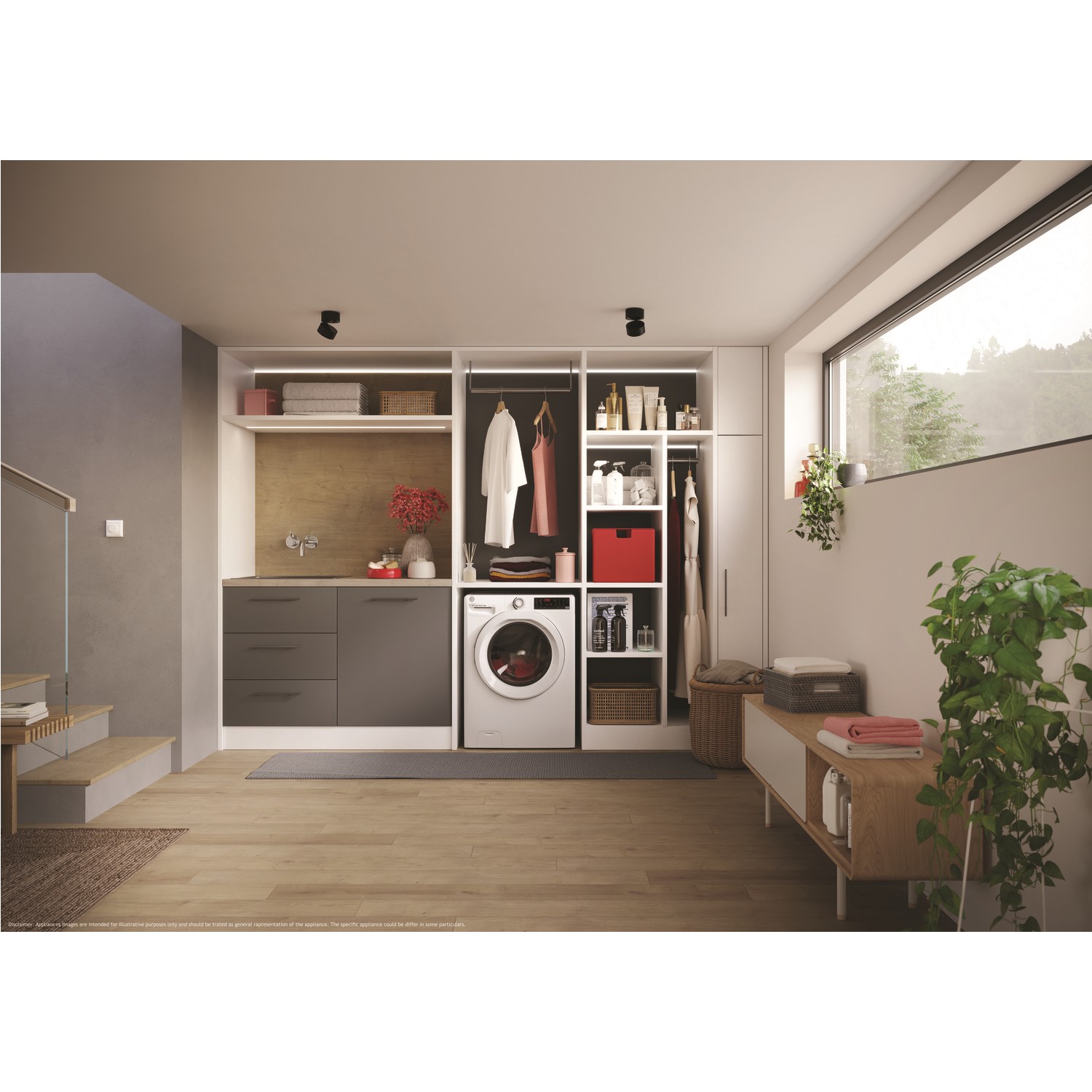 This Hoover washing machine also helps you cut your bills thanks to its A-10% energy rating, which uses 10% less energy than standard A-rated washing machines, and the KG Mode Plus, weighs your laundry to use just the right amount of water and power. Enjoy quieter washes with the ECO-Power Inverter Motor and keep your clothes looking their best with exceptional care programmes like Steam Care for freshness and Hygiene+ for a deeper, bacteria-free clean. With features like Anti-Crease for less ironing and an Eco-Doser to save detergent, this reliable machine makes everyday laundry effortless.