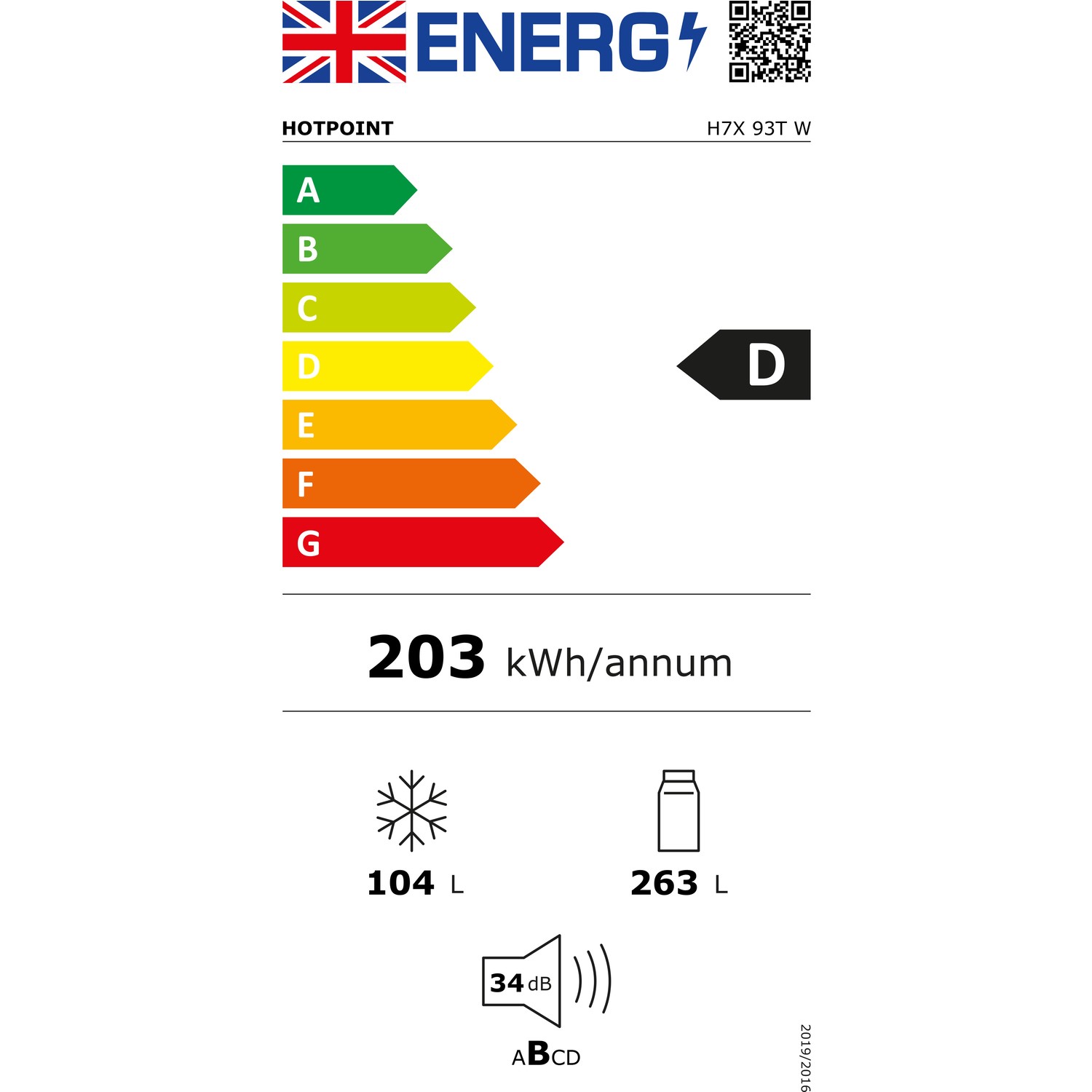 The Hotpoint freestanding H7X 93T SW fridge freezer is full of thoughtful technology that takes care of your fresh and frozen food. Hotpoint's Total No Frost technology constantly circulates air, preventing ice and moisture build up in both the fridge and freezer, so you never have to defrost your appliance again. With Active Oxygen, bacteria and viruses are reduced by up to 99% creating the right environment for your fresh foods and keeps bad odours at bay. The Active Fresh function helps you to prevent food waste by ensuring the ideal temperature levels for longer food preservation. This Hotpoint model comes with a dedicated area for your meat and fish thanks to the Fresh Zone 0°C, creating a healthy space to care for your delicate foods.