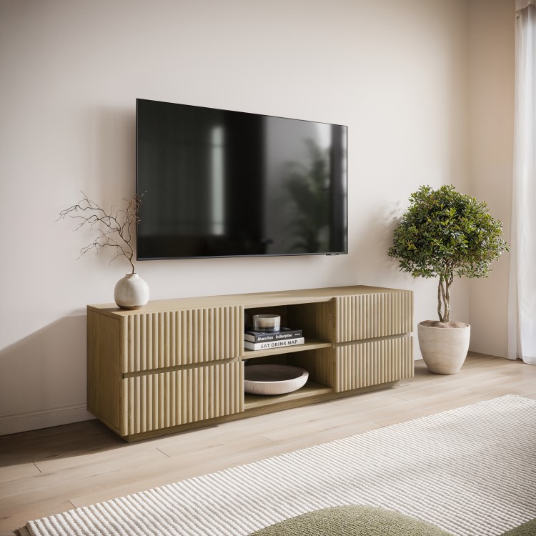 This contemporary freestanding TV unit combines clean lines with textured detailing to create a stylish focal point for your living room. The ribbed drawer fronts introduce subtle detail, while the natural oak-effect finish adds warmth and balance to the overall design. Built with everyday use in mind, the unit features four spacious drawers for storing remotes and other items, as well as an open shelf for media devices. Two cable management cut-outs help maintain a tidy and organised TV setup.