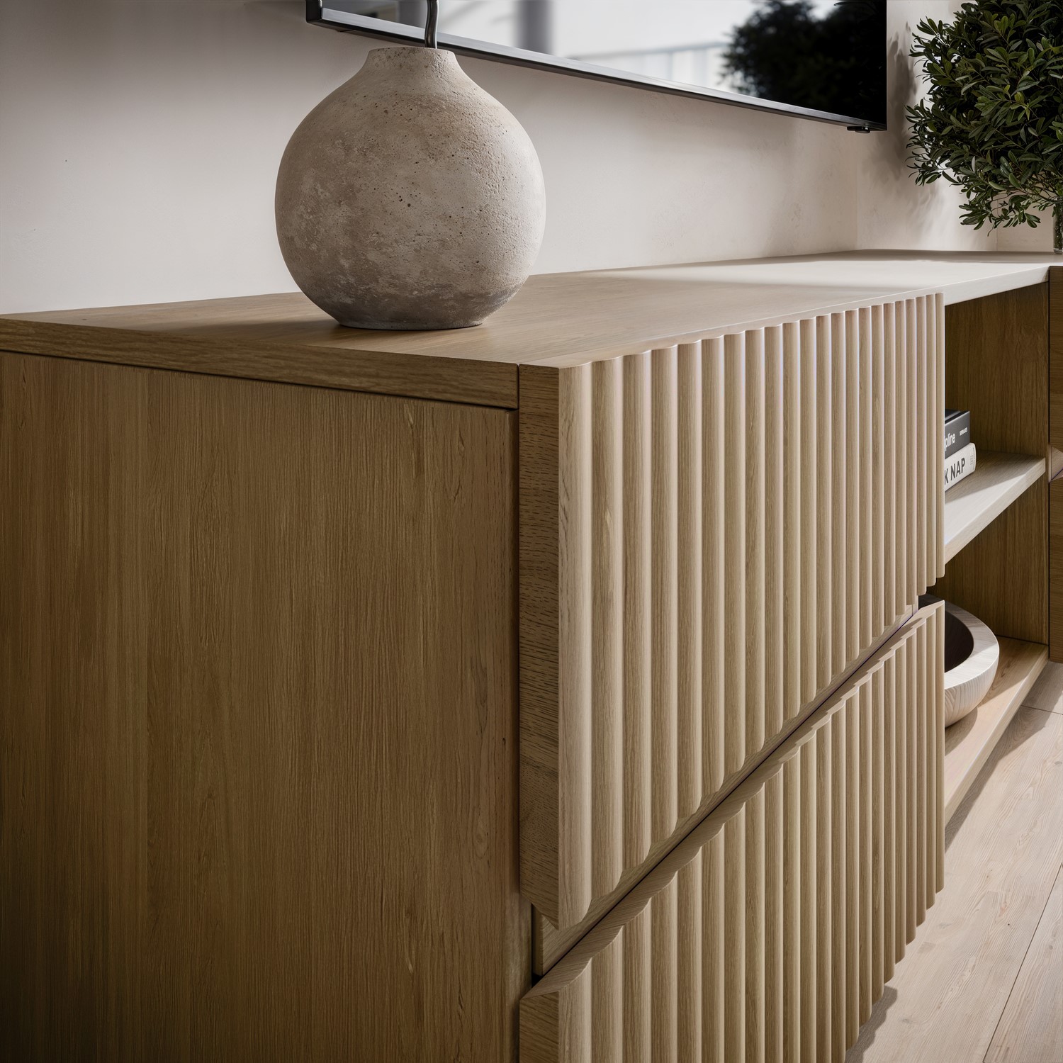Oak-effect ribbed drawer fronts introduce texture and depth, adding a refined, modern finish to your living space.