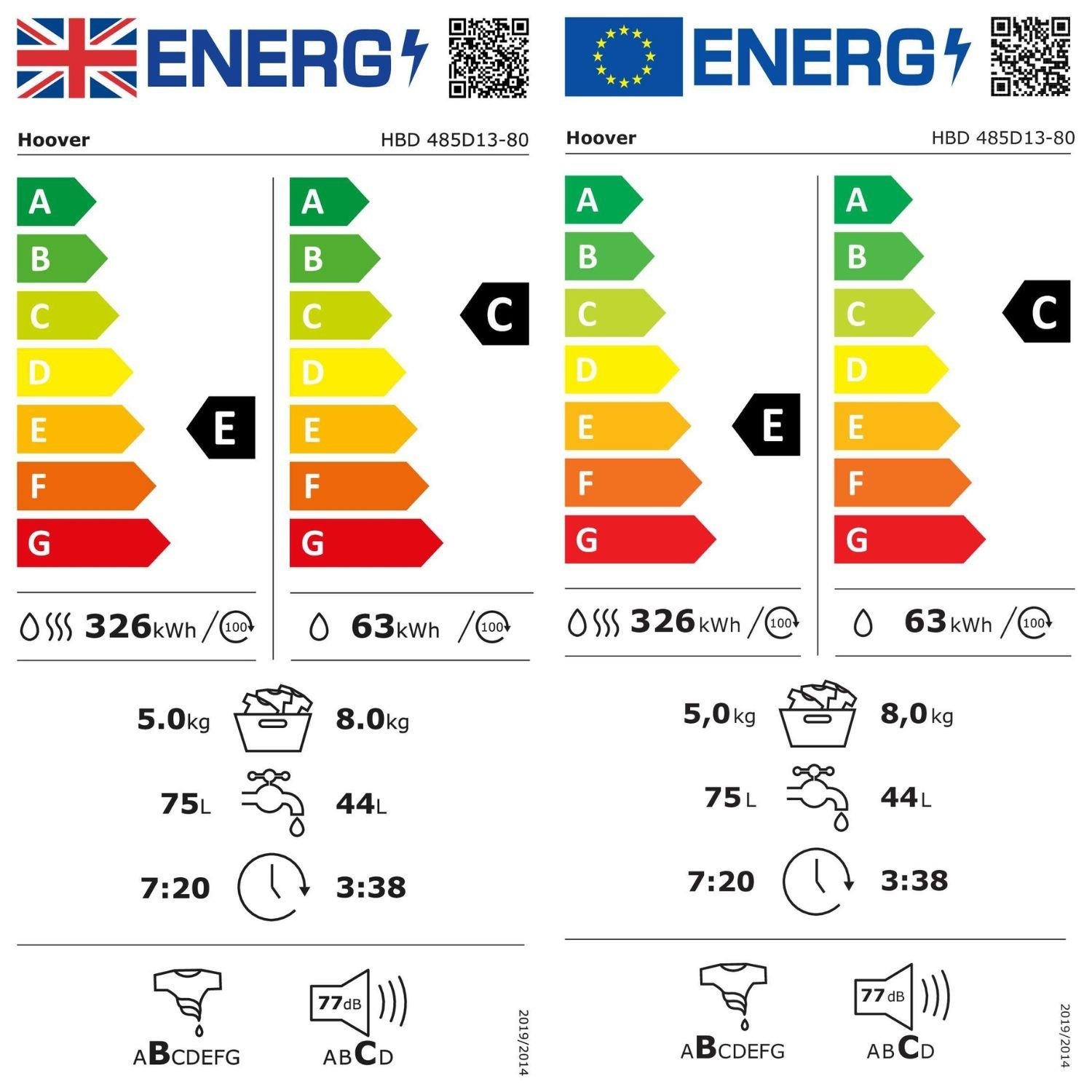 Washer Dryers energy class ranges from G to D, with Wash Only Energy ratings ranging from F to A. With a rating of D and A being the most efficient, helping save energy, money, and the environment.