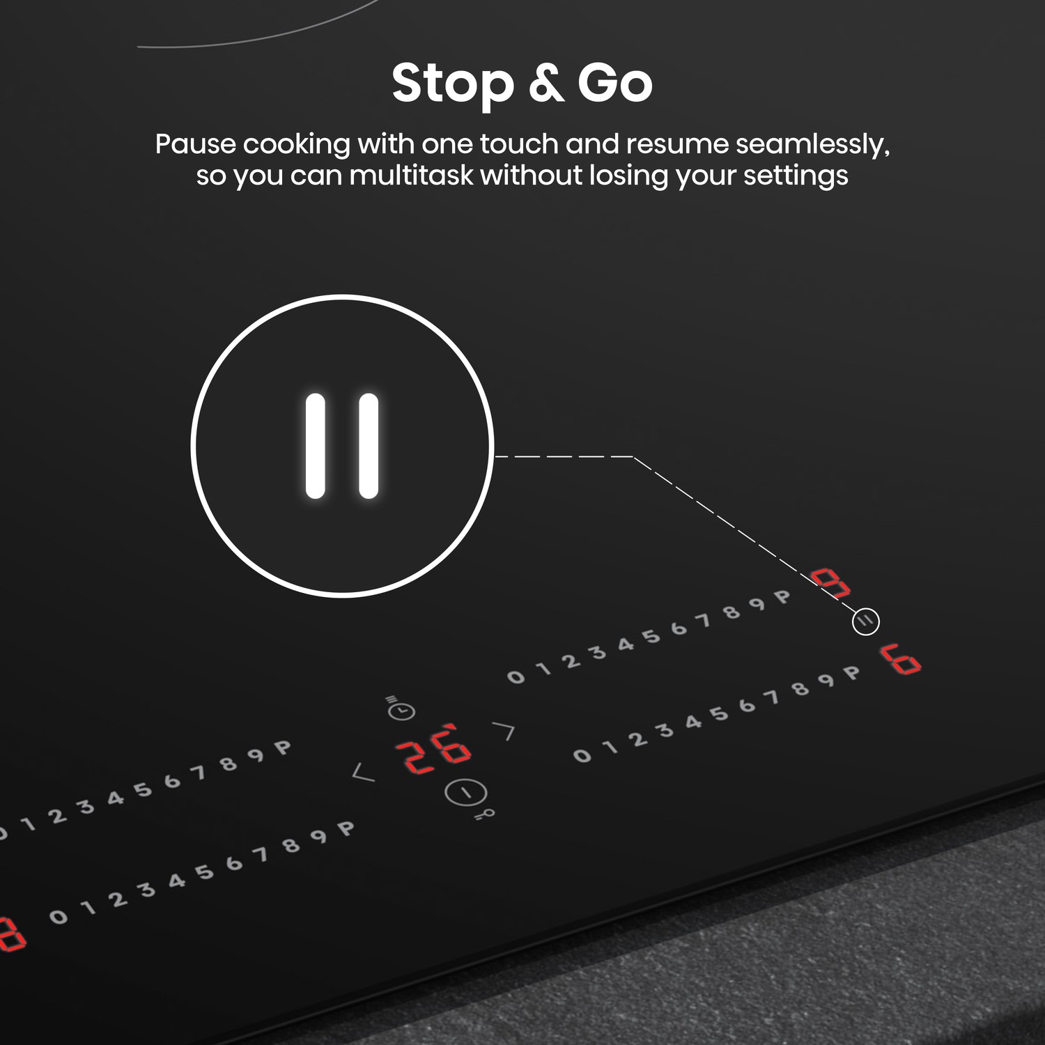 The stop & go feature offers ultimate convenience by pausing your cooking with a single touch, allowing you to step away without losing your settings. When you’re ready to resume, simply press again and your hob picks up right where you left off. Perfect for those moments when you need to multitask, stop & go ensures your meal is cooked to perfection without any hassle.