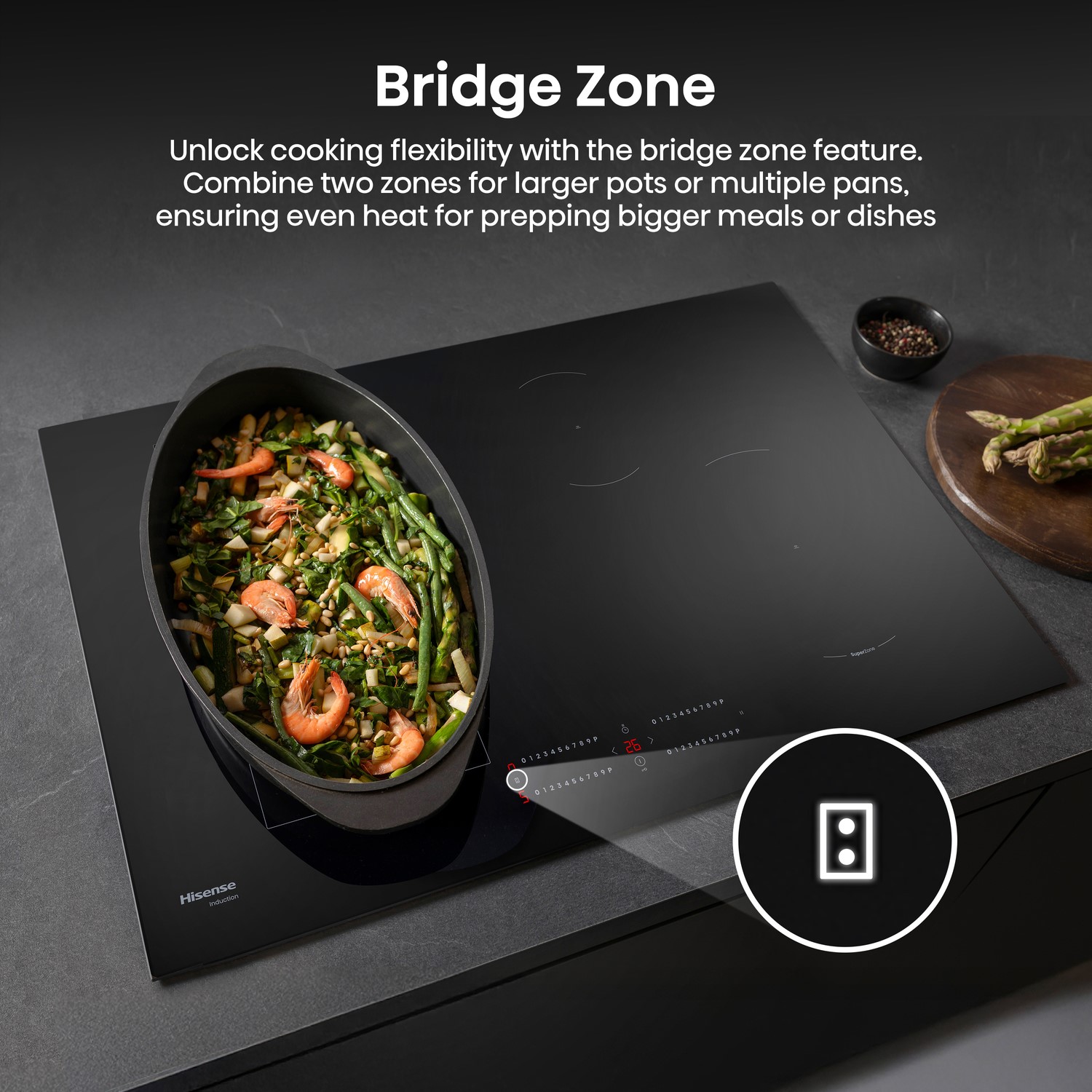 Unlock greater cooking flexibility with the bridge zone feature. By combining two separate cooking zones into one larger area, it accommodates bigger pots, roasting dishes or multiple pans. This feature ensures even heat distribution across the entire surface, making it ideal for prepping larger meals or experimenting with a variety of dishes.