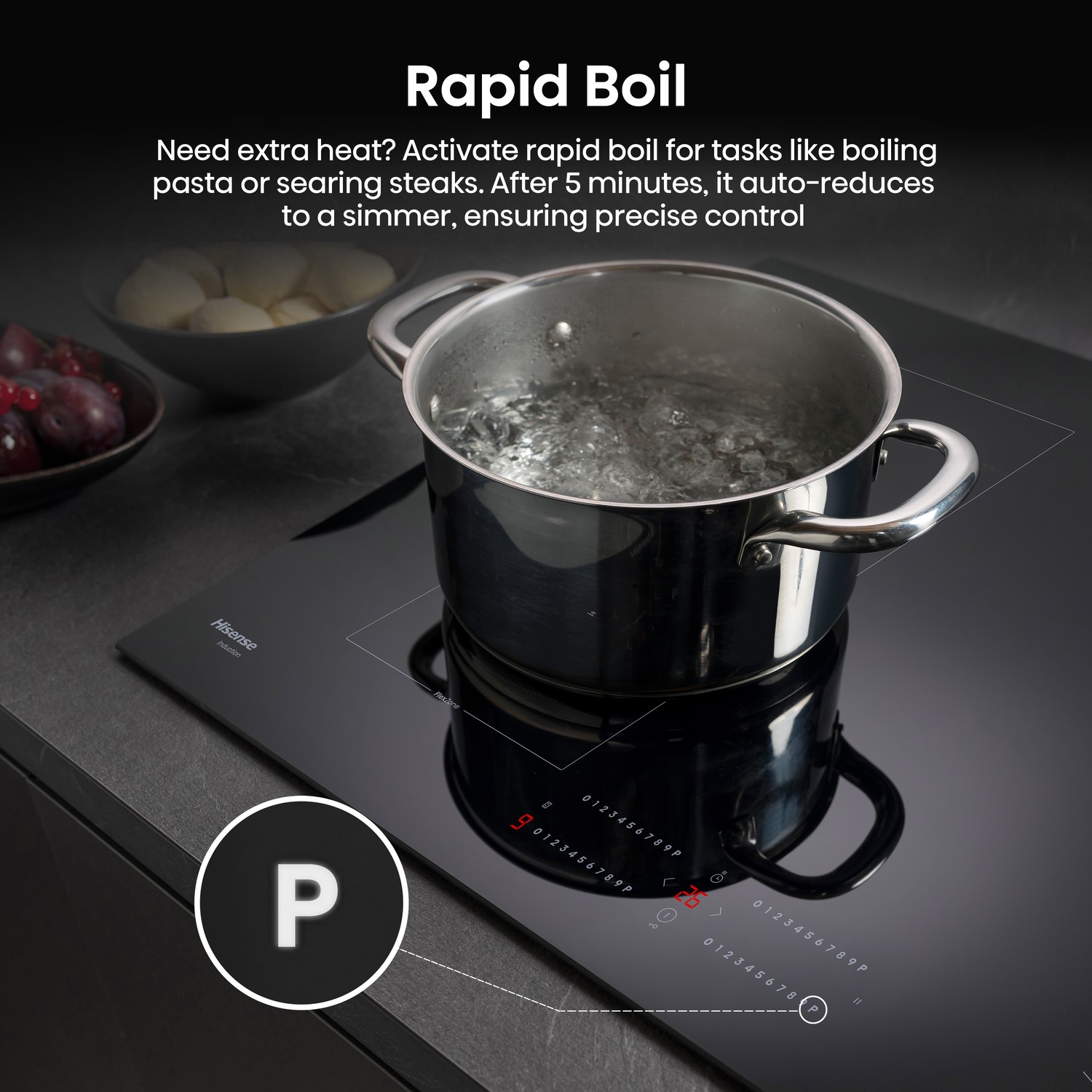 Need an extra burst of heat? Activate rapid boil. This setting is perfect not only for boiling pasta but also for searing steaks and flash-frying seafood. After 5-minutes of intense heat, the temperature automatically reduces to a low simmer, giving you precise control for perfect cooking every time.