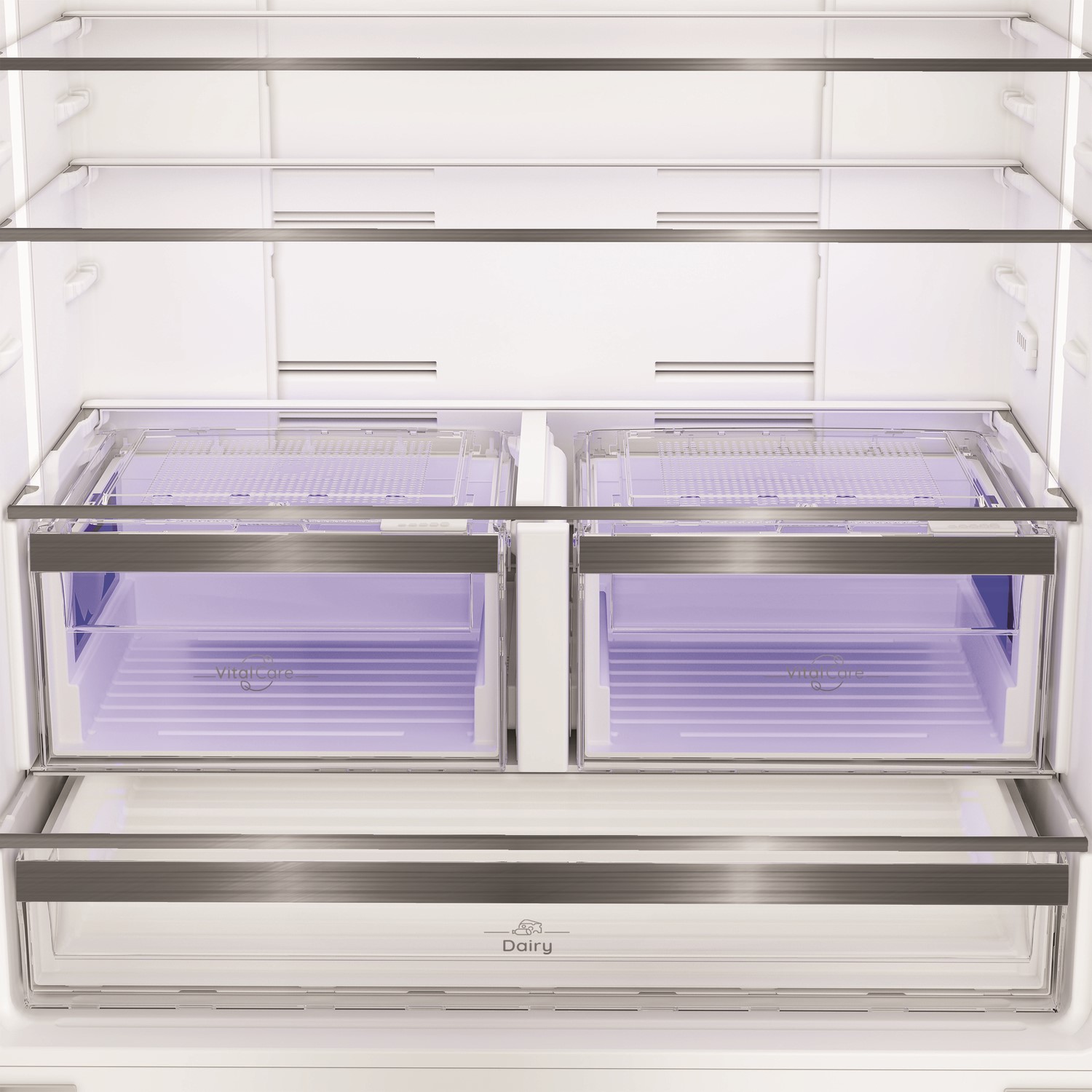 Inside, the VitalCare drawer keeps fruit and veg packed with nutrients and antioxidants for up to a week by gently illuminating them with natural light, while the Fresh Shield zone locks in freshness for longer** by balancing temperature and humidity levels perfectly. There's also a Fast Freeze function that rapidly drops the temperature when you've just stocked up the freezer with groceries.