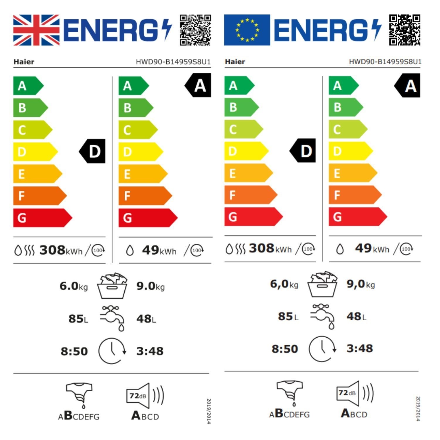 (1) A-Class energy rating is only applicable to wash-only cycles. Combined cycle energy class D-rated.
