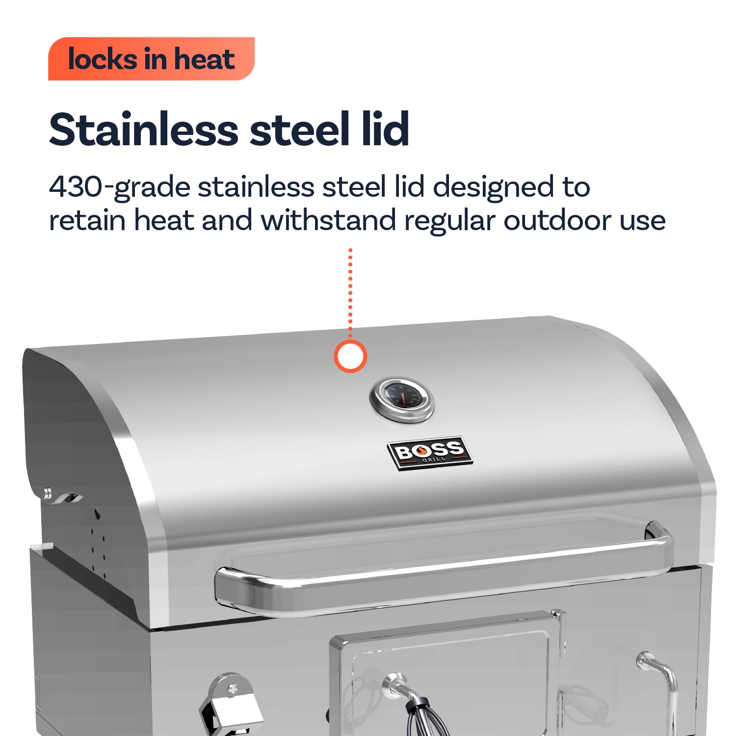 430-grade stainless steel lid designed to retain heat and withstand regular outdoor use.