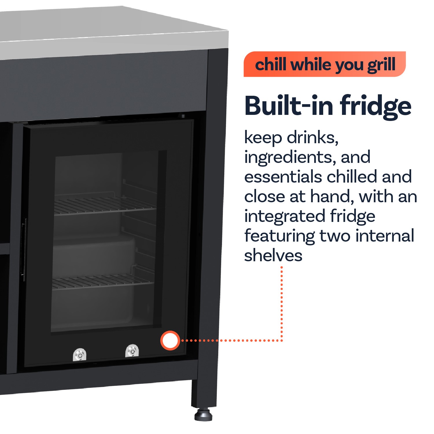 Keep drinks, ingredients, and essentials chilled and close at hand, with an integrated fridge featuring two internal shelves.