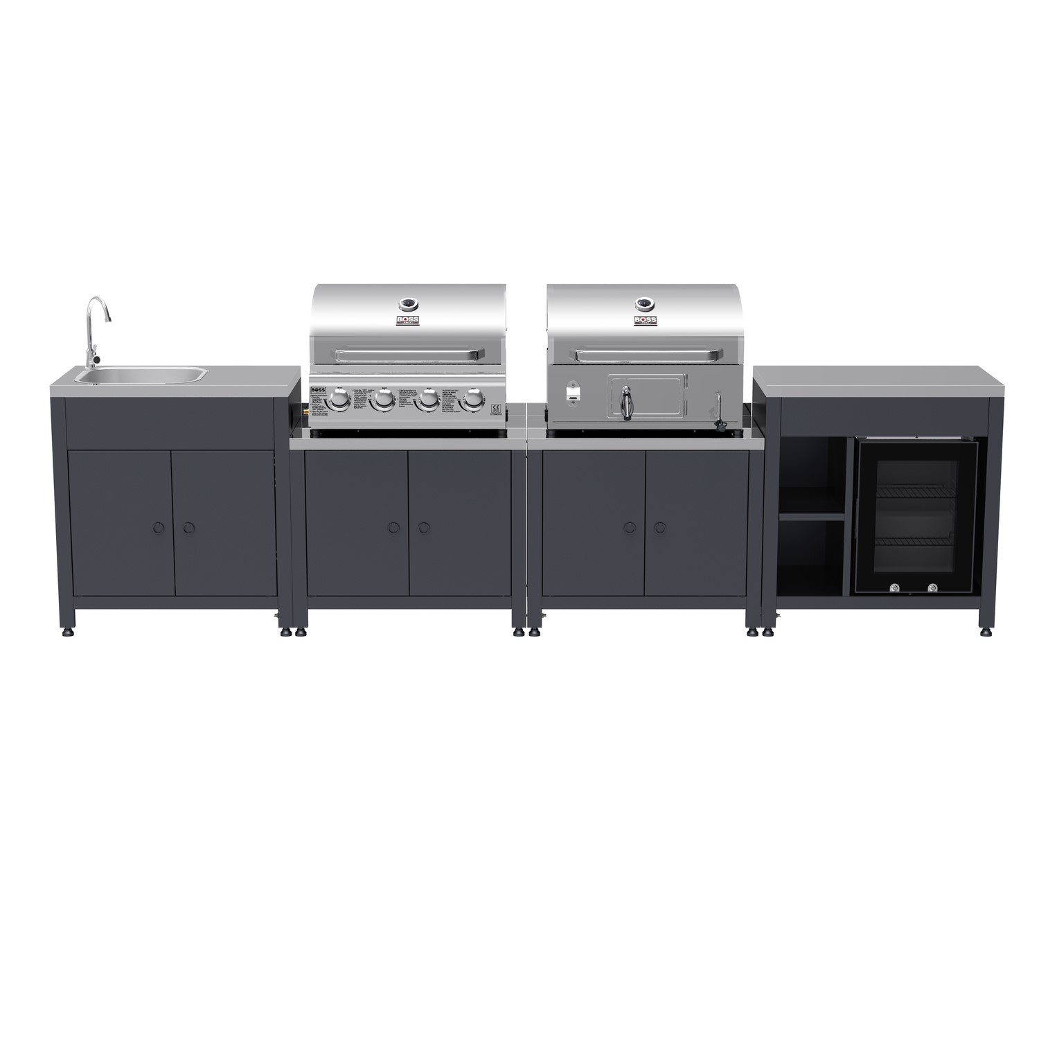 - Complete modular outdoor kitchen BBQ system combining gas, charcoal, prep, and cooling in one seamless setup