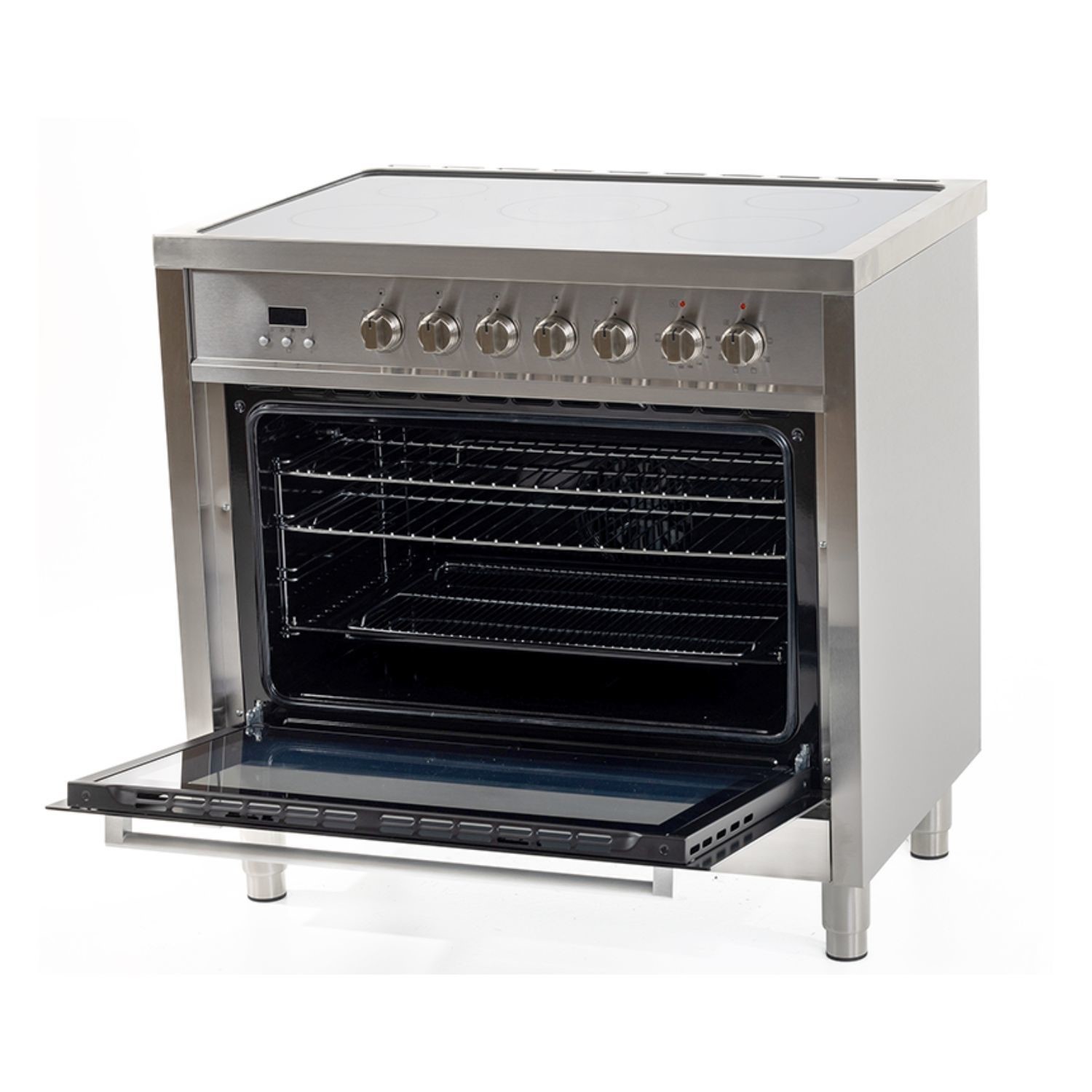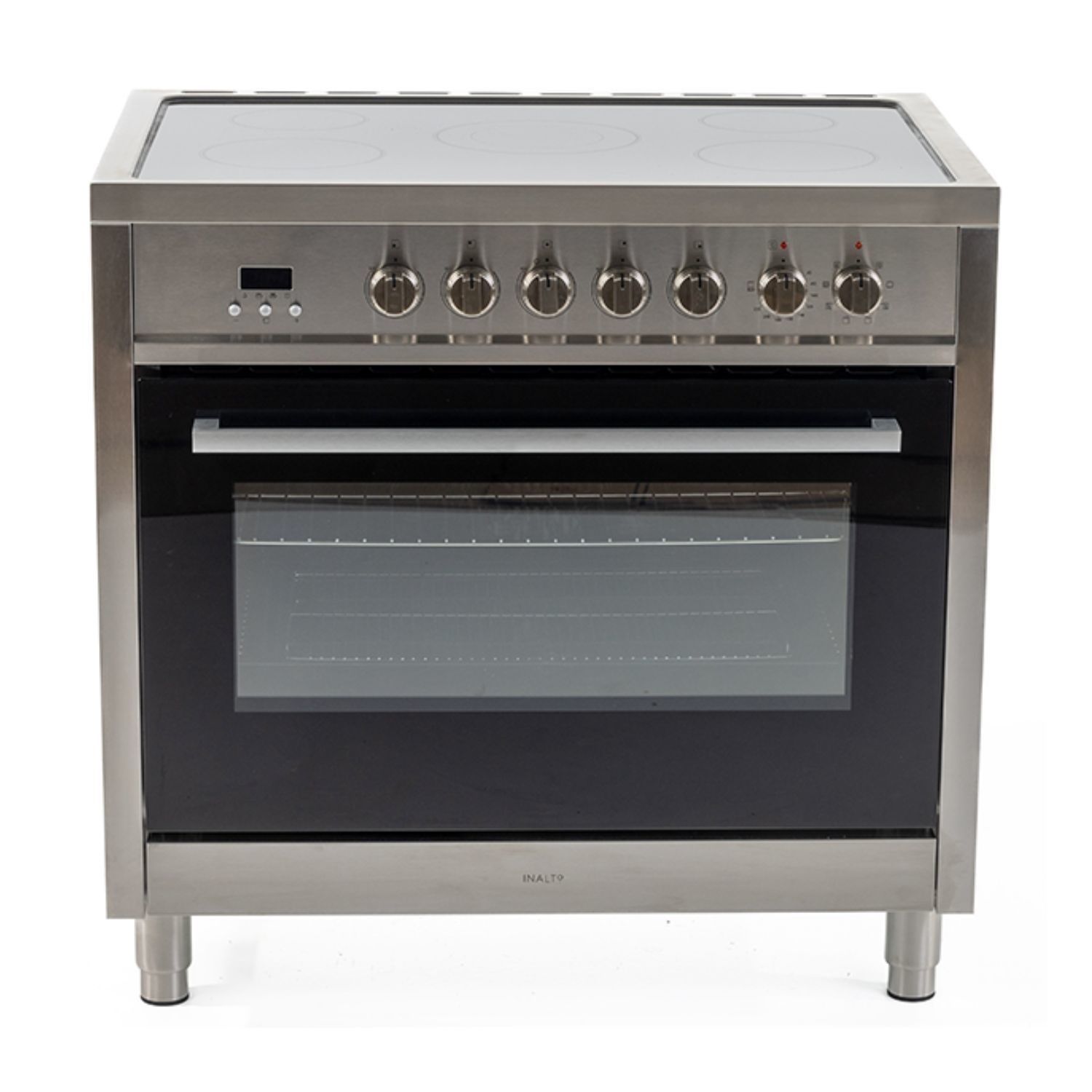 With its sleek stainless steel finishing, the InAlto 90cm Single Ceramic Range Cooker makes a contemporary statement in any kitchen. Featuring a 5 zone ceramic cooktop, 103L oven capacity and seven electric oven functions this oven can take on any recipe with ease. Utilising thoughtful safety features, such as easy-slide heavy duty chrome side racks, the exemplary specifications of the oven range are mirrored by modern British design. Furthermore, keeping your oven clean is effortless with an easily removable inner glass door design & an enamelled interior that prevents the build up of fats or oils.