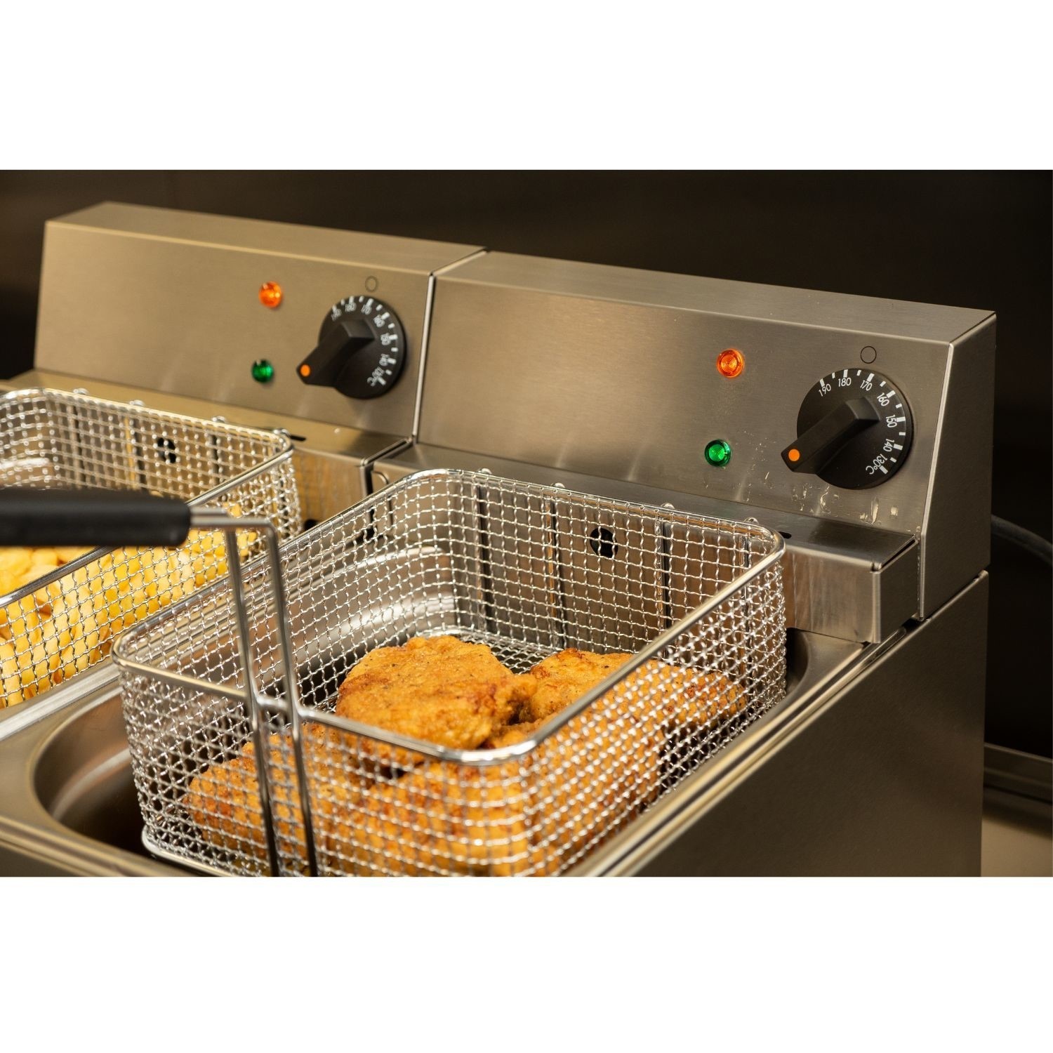 This sturdy unit is fitted with two 13A plugs, allowing for immediate setup on any standard UK power supply without the need for specialist hardwiring. Measuring 540mm wide, it makes maximum use of minimum workspace while providing precise thermostatic control between 130°C and 190°C. For added safety, each tank is equipped with a fail-safe top temperature cut-out to prevent overheating during busy shifts.