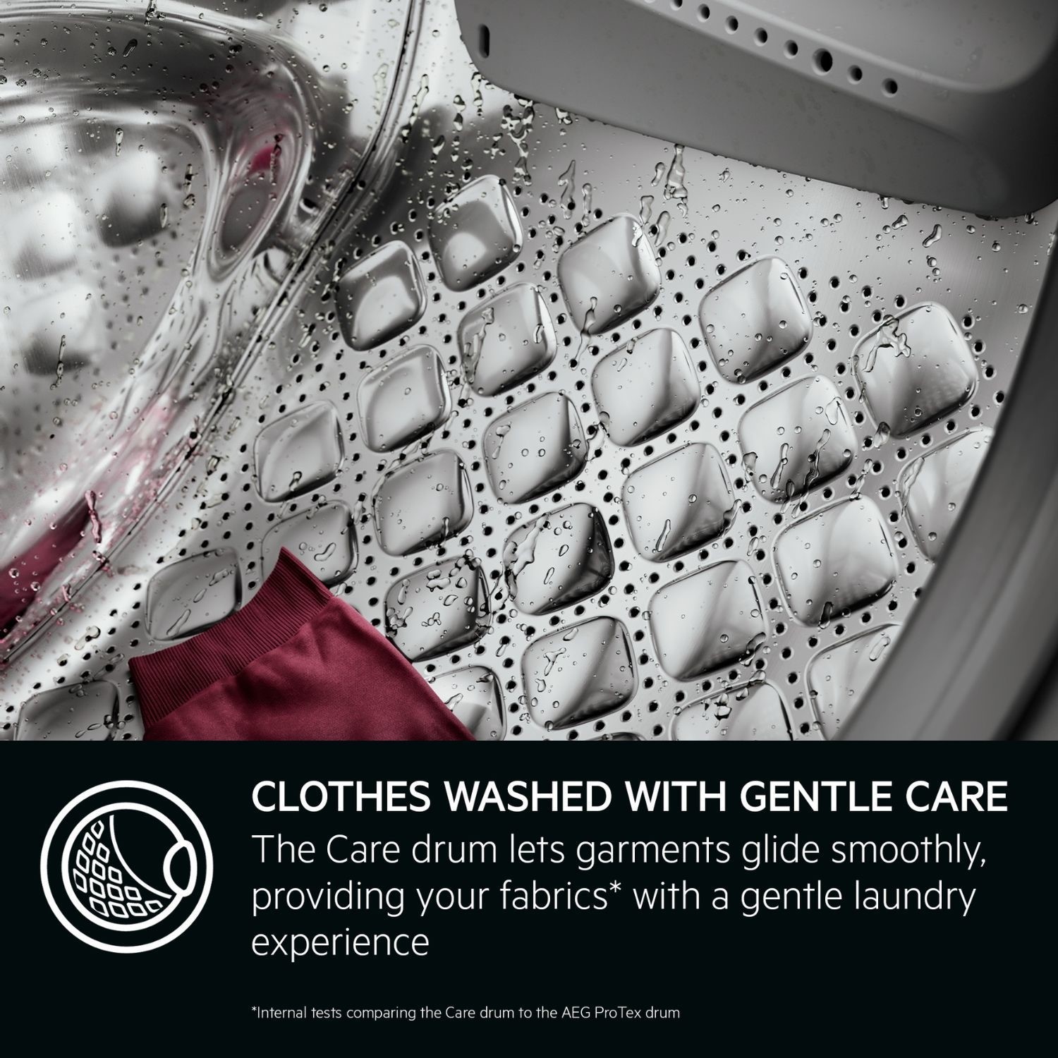 The Care drum lets garments glide smoothly thanks to its elevated cushion-like drum pattern and optimised lifter paddle. A thin film of water covers the holes during washing. Providing your fabrics with an even gentler laundry experience.