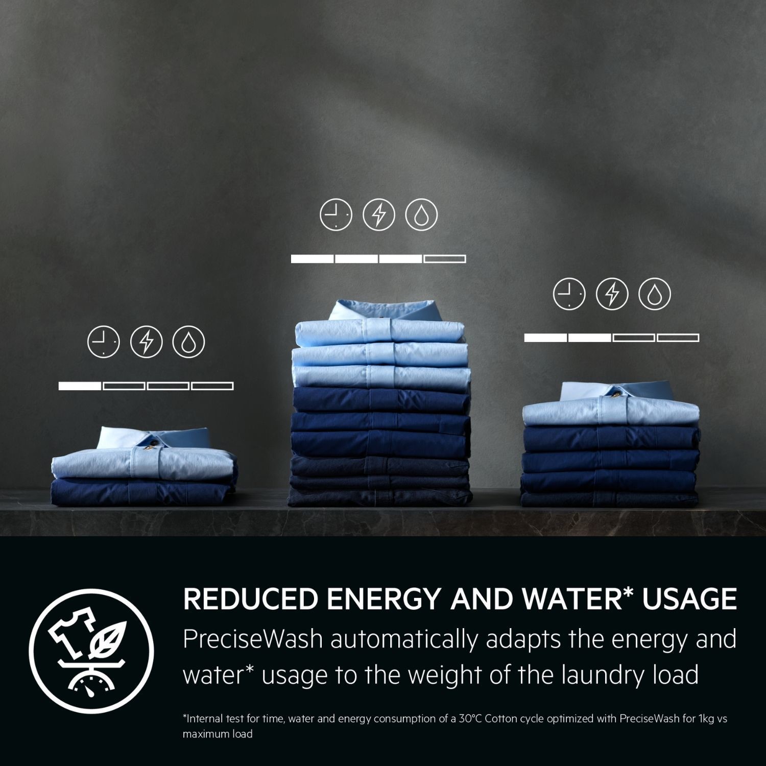 Precisewash reduces up to 40% of time, water and energy by optimising every load