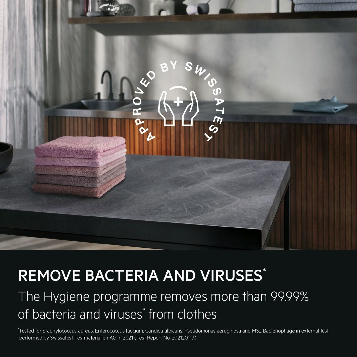 The Hygiene programme certified by Swissatest is a high-performance wash cycle that removes more than 99.99% of bacteria and viruses from clothes. By keeping your wash temperature above 60°C, you can also reduce allergens.