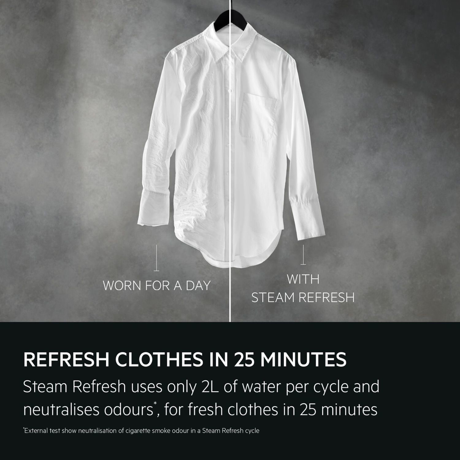 Steam Refresh neutralises odours and reduces wrinkles on garments, including delicates, in just 25 minutes. And if you like an extra boost of freshness, just add our aromatic steam fragrance. Giving it that just washed freshness.