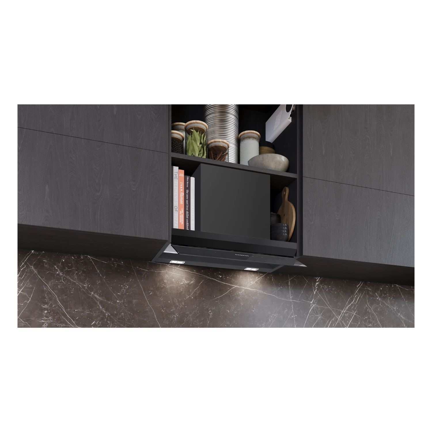 Never enough storage in your kitchen cupboards? With its compact, t-shaped design, the Siemens Integrated design hood not only clears the air—it frees up space. Thanks to the sturdy construction, you can now store up to 10 kg on each side of the hood. Whether it’s spices, cookbooks, or utensils, everything you need is right where you want it: within easy reach and cleverly stored. Smart design that makes more of your space.