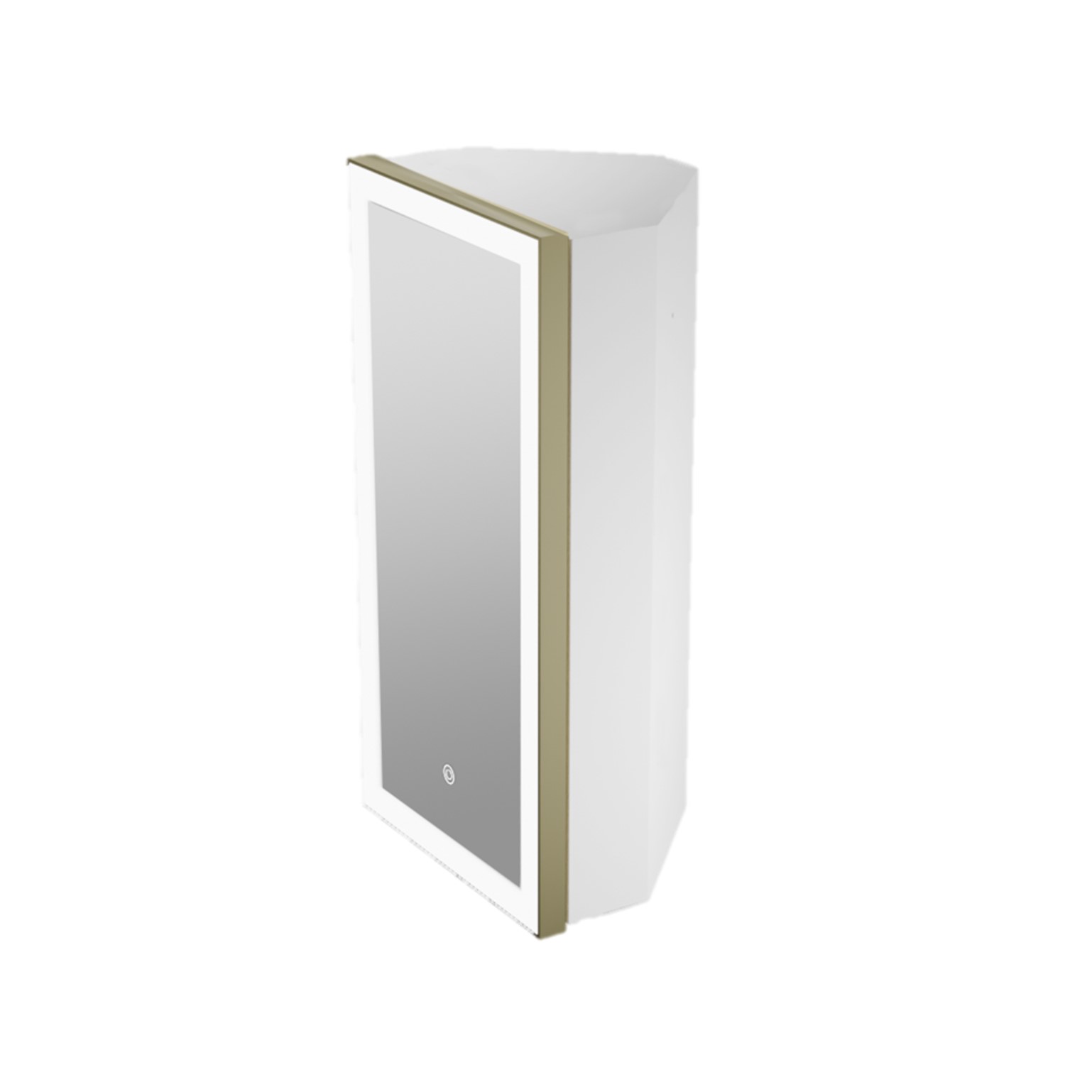 Transform your corner space into a functional storage solution with this elegant Lykos LED mirror cabinet. The clever corner design making brilliant use of often-wasted space. The sophisticated matt white body with brushed brass frame complements contemporary bathroom schemes, whilst the mirrored surfaces help smaller spaces feel more open and bright.