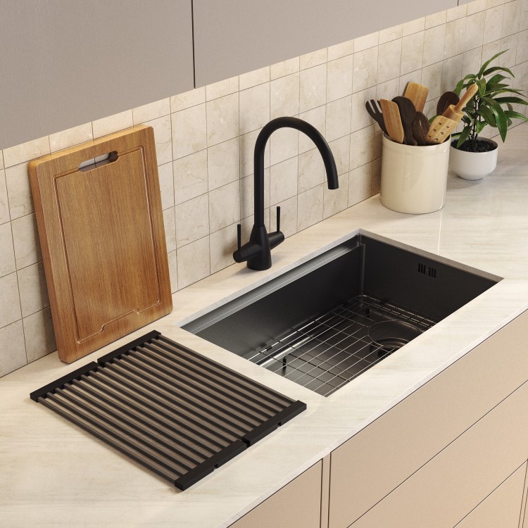 The Black Mae Workstation Sink is designed to make everyday kitchen tasks faster, easier and more organised. By turning your sink into a multi-functional prep zone, it helps you chop, rinse and drain in one central space — reducing mess and keeping your worktops clear. The bold matte black nano finish creates a striking focal point in contemporary kitchens, while its durable coating stands up to daily use. It offers the best of both worlds: a protective nano coating for enhanced resistance to scratches and wear, combined with a subtle linen-textured pattern that helps conceal water spots and minor marks. Whether you're prepping family meals or cleaning up after entertaining, the deep single bowl offers generous space for larger pans and trays. Practical as well as stylish, the protective grid base helps prevent dents and scratches, while the built-in overflow adds extra reassurance. It’s a smart upgrade that improves both the look and function of your kitchen in one simple installation.